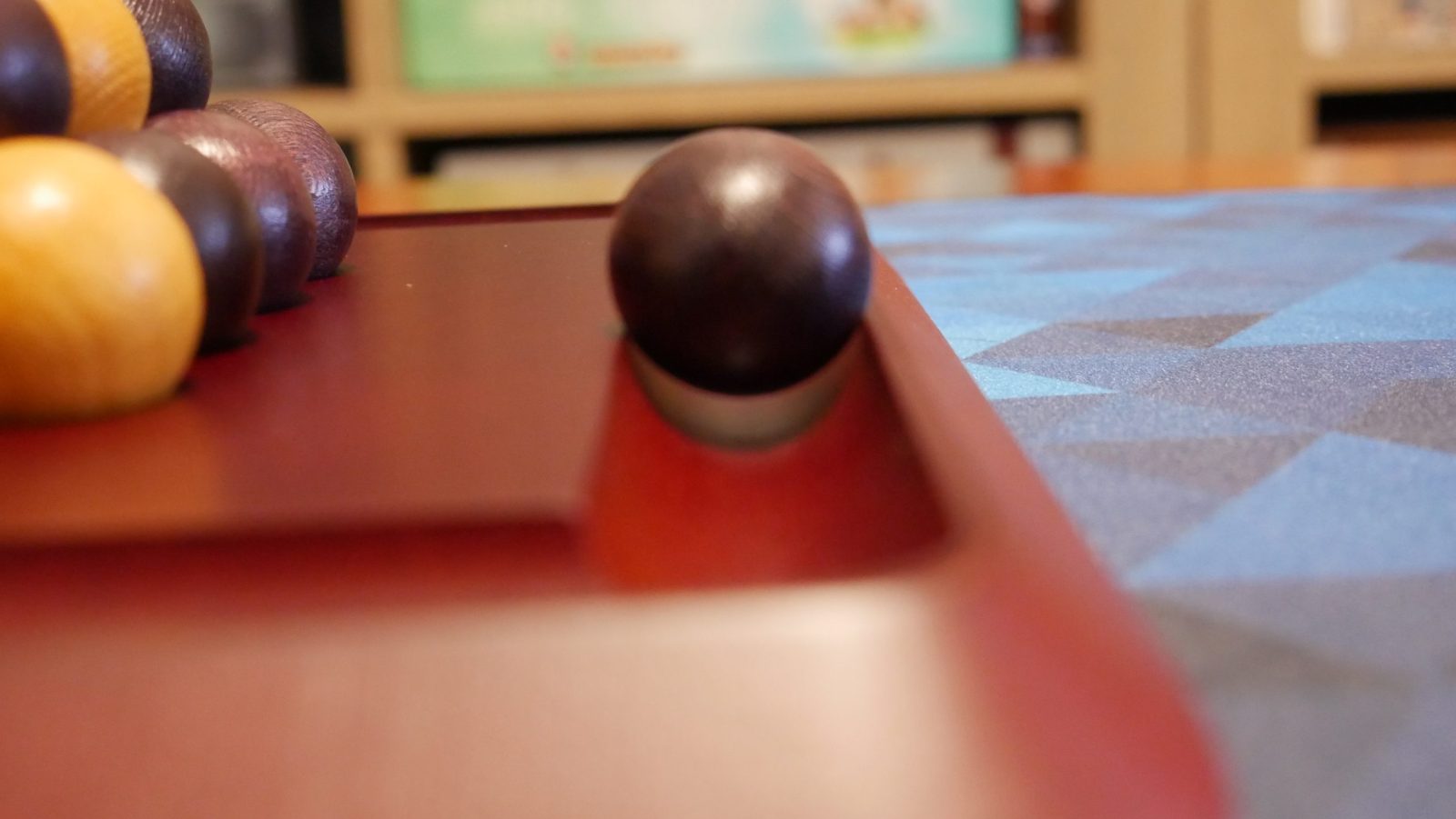 The production of Pylos doesn’t get a pass either. It has the same style of sturdy board as others in this line from Gigamic and the pieces are nice and solid wood. However, it’s a bit of a mess. For starters, the balls are all meant to sit in the carved channel around the edge of the board. At the start of the game, the balls absolutely do not all fit in the channel. If you take out the first piece, they still do not fit nicely. The slightest nudge is going to send balls flying. The reason for that, is the channel is carved with a different radius than the balls so they don’t actually even sit in the channel as designed. Speaking of the balls, my game either came one short, or more likely, we immediately lost one during the first game when several inevitably flew out of the channel and scattered across the room. Mind you this was in a rental at PAX Unplugged and despite several days of intermittent searching, the missing ball was never to be seen again. All of this packs up in a standard size game box which seems like a crime of shelf space for 3D Tic-Tac-Toe.