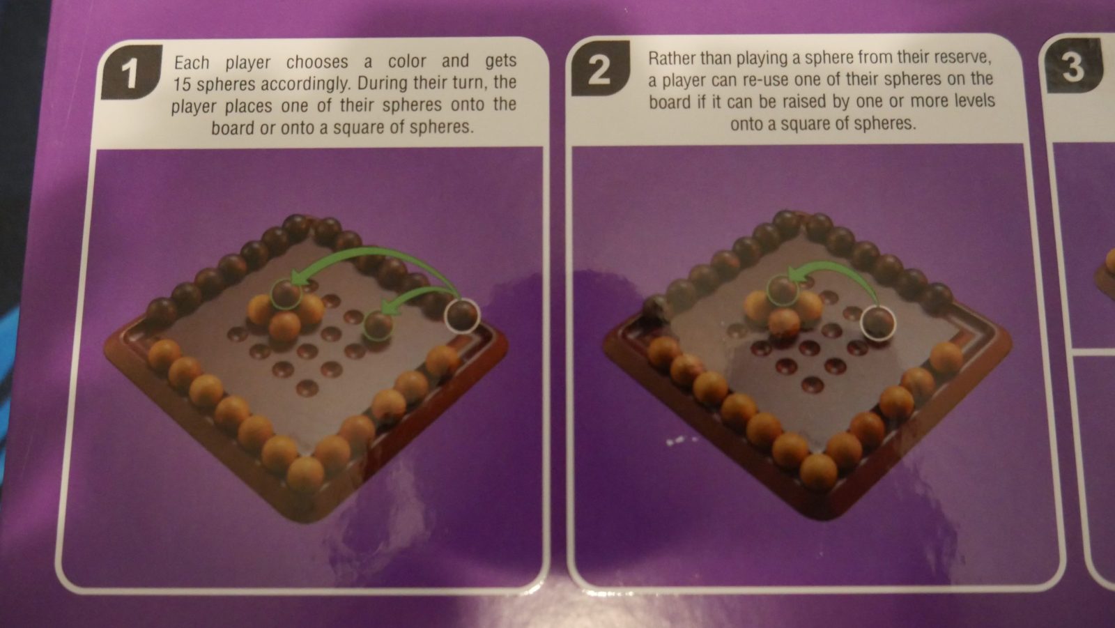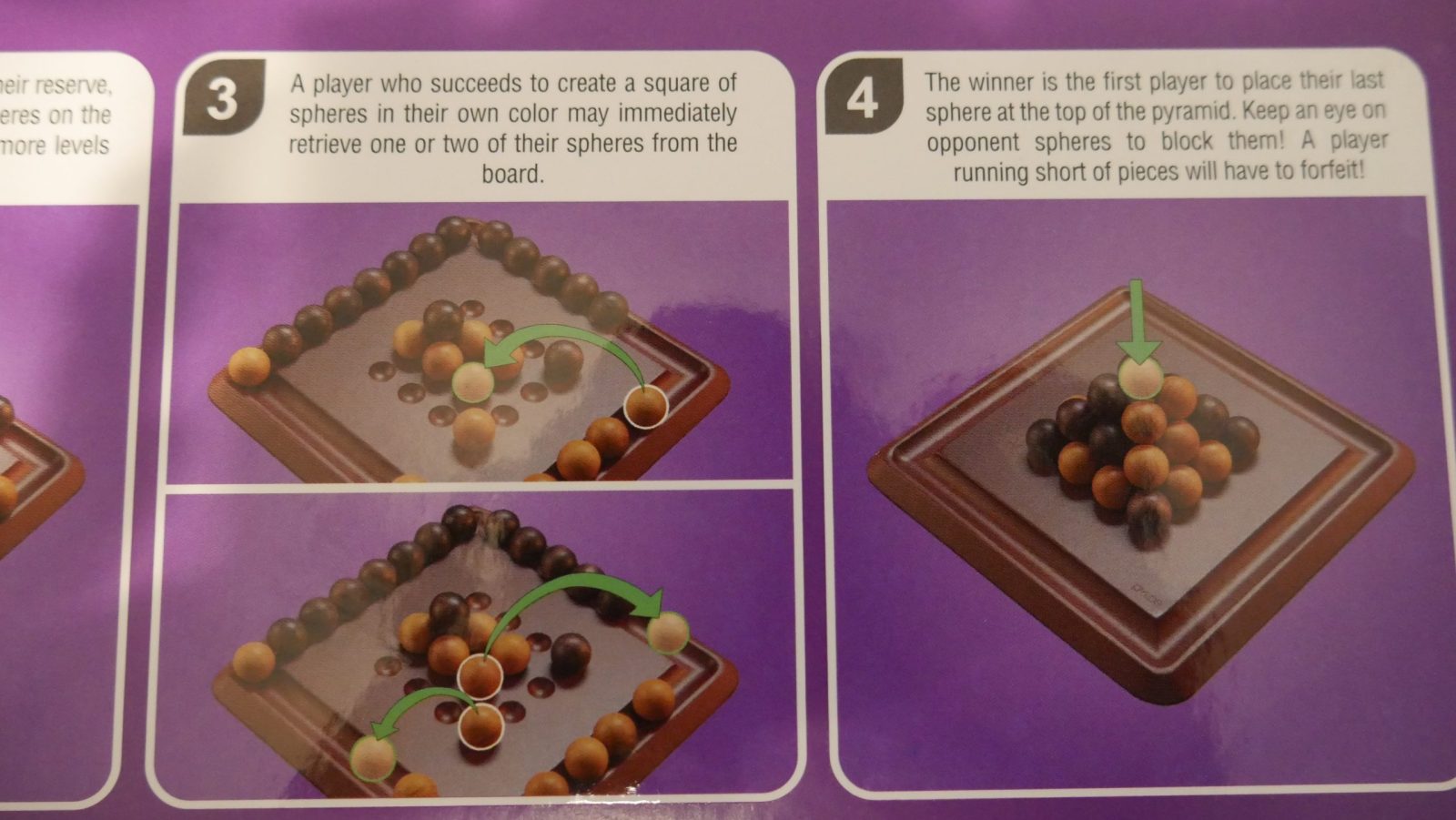 The rules for Pylos are very straightforward. In fact the entire game can be learned from the back of the box without even cracking the rulebook. To prove my point, I won’t even explain the game, just take a look at the box picture below.