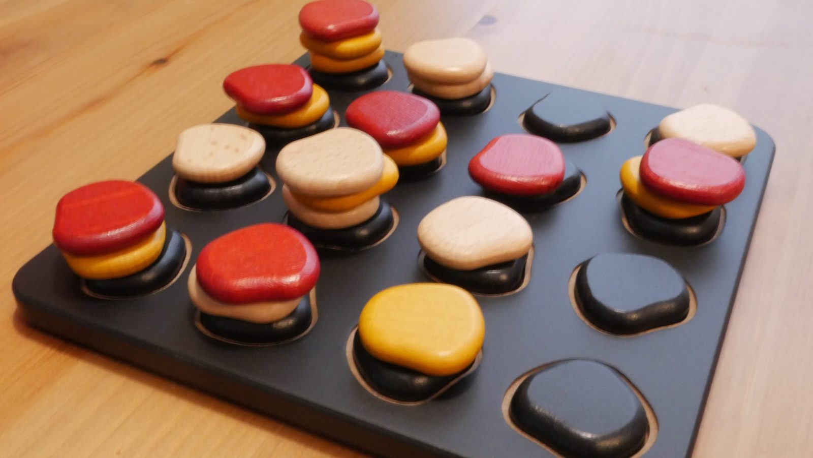 As stacks of stones get higher, the reach of each new stone increases and it becomes harder and harder to anticipate where the other player is going to act. Blocking is extremely important in Qawale. You need to worry about what is right in front of you as rows are formed but also what is underneath. A stack being moved can be a double edged sword. Opening paths for yourself but also the other player if you are not careful. Thinking in three dimensions is rewarded and setting up win conditions ahead of time is required if you want any chance of not losing or ending in a tie.
