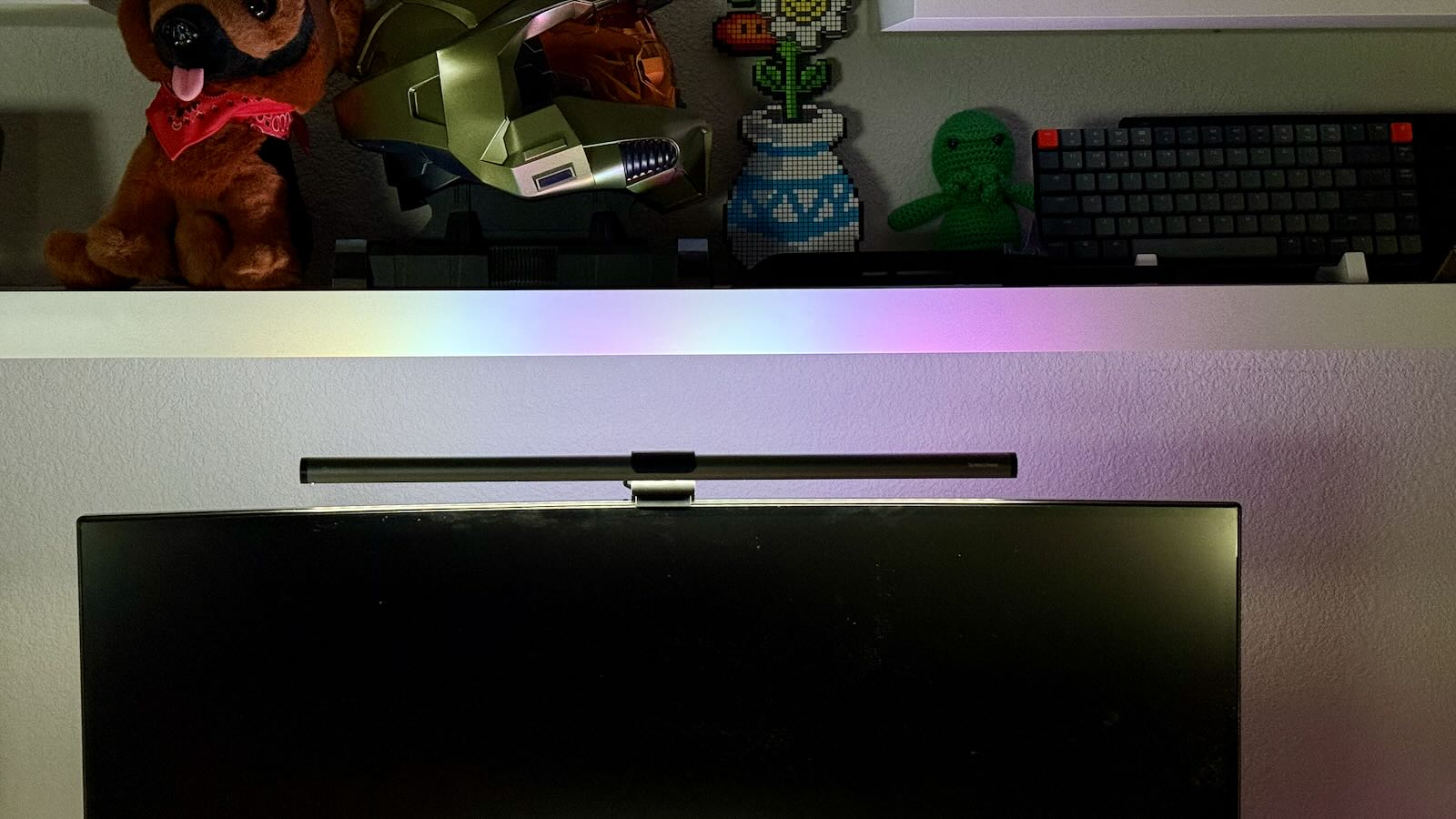 On the backlighting side, the RGB modes add a nice touch of ambiance, especially when switching to one of the cycling color options. However, since there’s no brightness adjustment, it can be a bit intense in low-light settings. The preset color pairings for the alternating modes work well, but the lack of custom color or brightness control is noticeable compared to other light bars. Luckily for me, cyan/purple—my desk and computer’s RGB setup—is one of the preset options, so it fits right in with my color scheme.