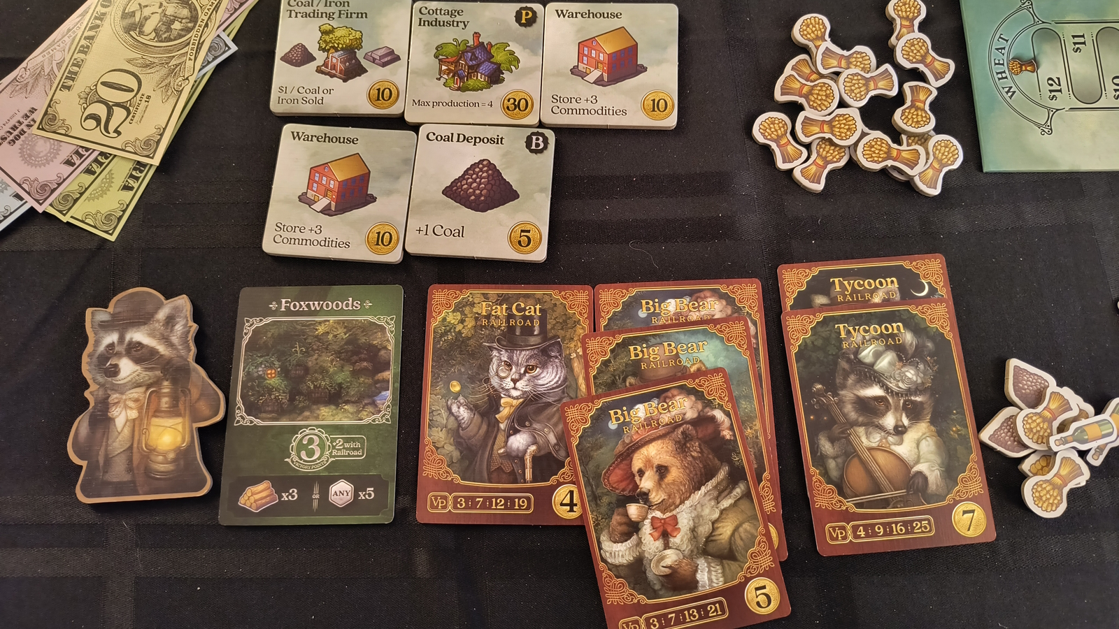 And that just about covers how the game is played. Players will keep taking actions right up until either the railroad or town deck runs out of cards. The simplicity is definitely a nice change of pace, especially for economic games. Players can choose to focus on specific strategies to win, such as producing cheap resources to purchase a bunch of towns, or producing expensive resources to get money and buy railroads.
