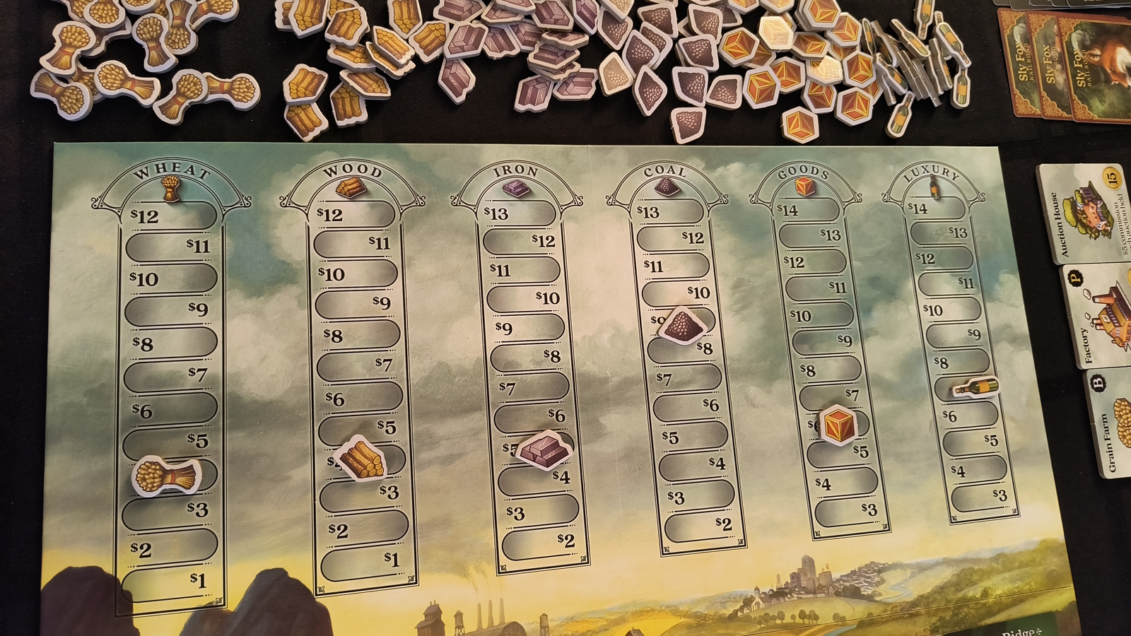 The second action you can take is to sell all of one resource, which nets you cash for its current value for each resource sold, and reduces the value afterwards by however many resources were sold. This leads to a boom and bust economy where you want to sell while the selling is good, but you need to be aware of your opponents looking to do the same.