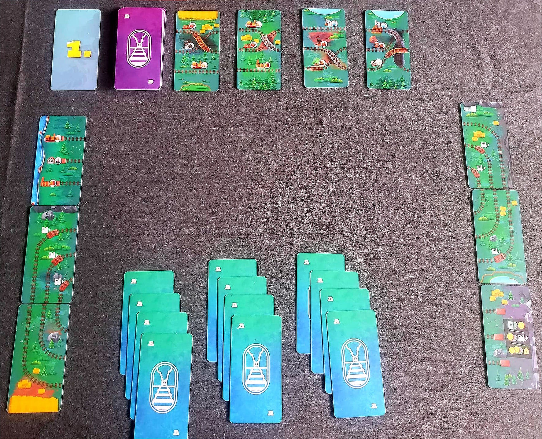 I admit the English translation of the Czech instructions did trip me up at times with some confusing wording and structure, but a quick jaunt over to the publishers how to play on YouTube quickly sorted that out. Set up is super simple: a randomly chosen starting player chooses which side of the starting station card to start on. Leave space for 8 track cards in between and place a corner track card at the end. Connect another corner rail underneath to loop the track back and repeat, ending the final row with the ending station. Refer to the image below for how to set up your gameboard.