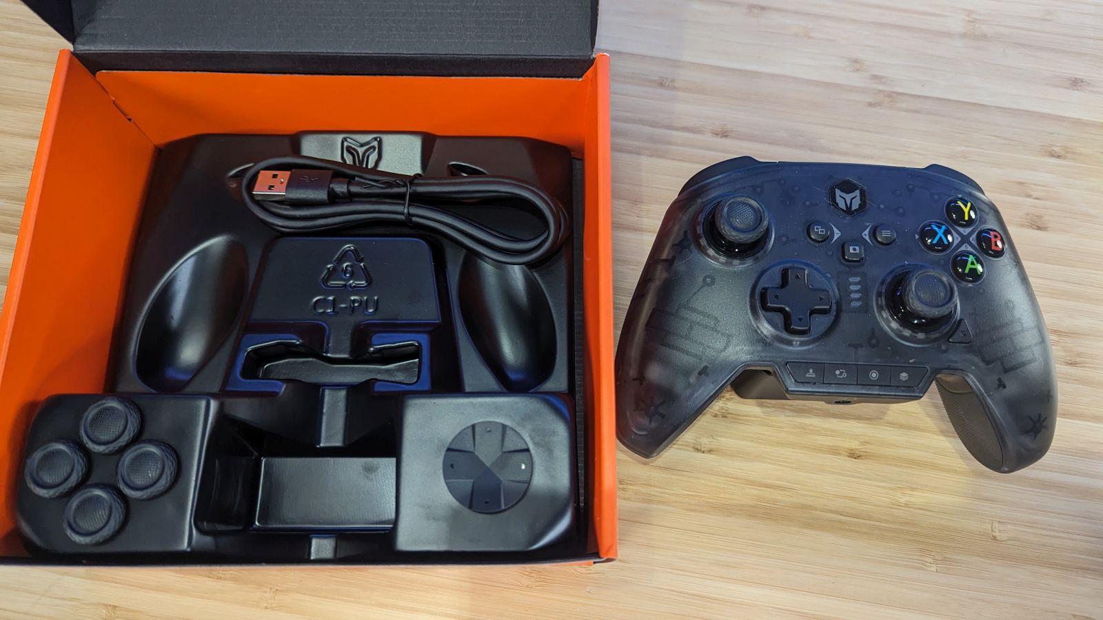Opening the box, I was surprised to see everything included with the Rainbow 2 Pro Elite. Obviously the controller, but also included are four sticks, a D-pad replacement, a wireless charging cube, a USB-C cable, and a dongle. Grabbing the cable and connecting it to the wireless charging cube, I started to charge the controller.