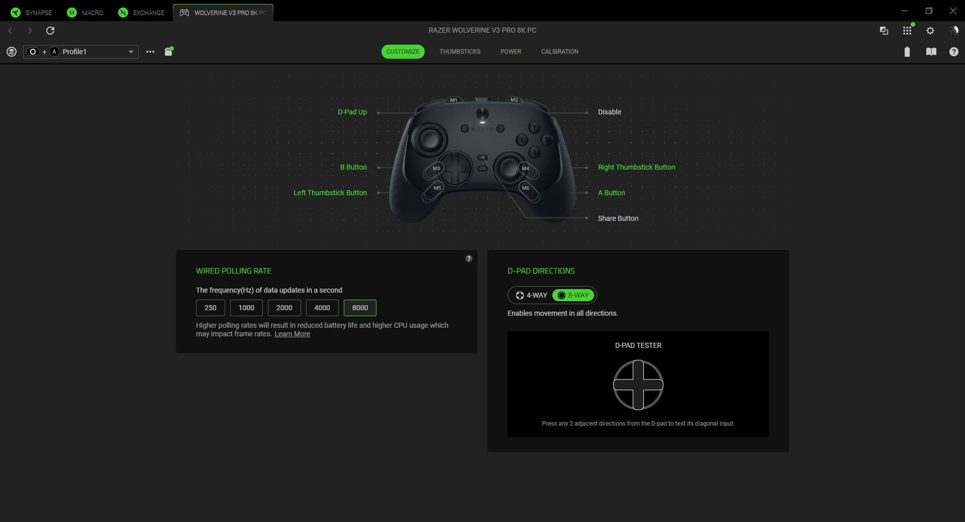 Lastly, let's dive into Razer’s proprietary software. If you’re familiar with Synapse, you know a lot of what it provides. Here you’ll be able to shift between polling rates, adjust your thumbstick sensitivity and response curves, and even change your D-pad between registering 8-way clicks to only 4-way, which I would imagine would be useful in a fighting game. You can also customize your back paddles and M-bumpers, even down to using a PC specific key as an input. Of course, adjusting your polling rate is in Synapse as well, so make sure you have it downloaded to take advantage of it. It’s not the most intensive application, but it does everything you could need it to do.
