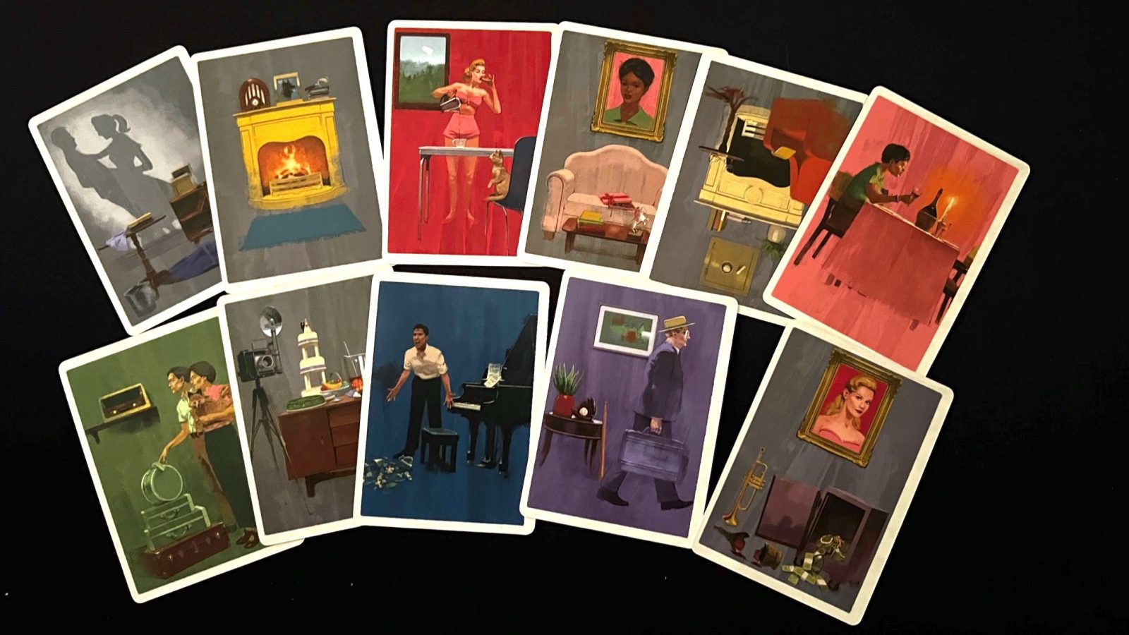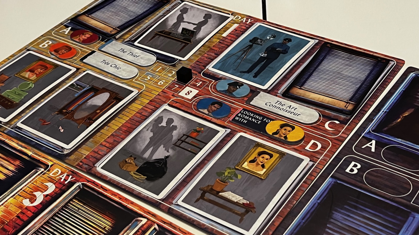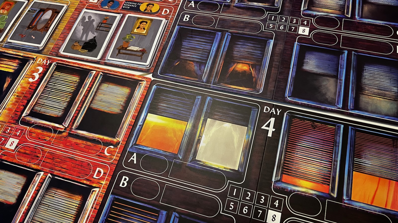 The production quality and theming of this game is spot on. The cards, the boards, and even the storage insert are all made of high quality materials. When opening the box the first time, you come across the player guide that looks like the cover of a magazine. Even the lining of the box gives players some aesthetically pleasing images. The artwork and color scheme takes you right back to the 1950’s and fits perfectly with the movie. The cinematic style of the Rear Window movie does close ups on the windows of the apartments which are incorporated into the day boards, giving small glimpses into the lives of the characters. Each of the cards is unique and draws you into a world of second guessing and wonder.