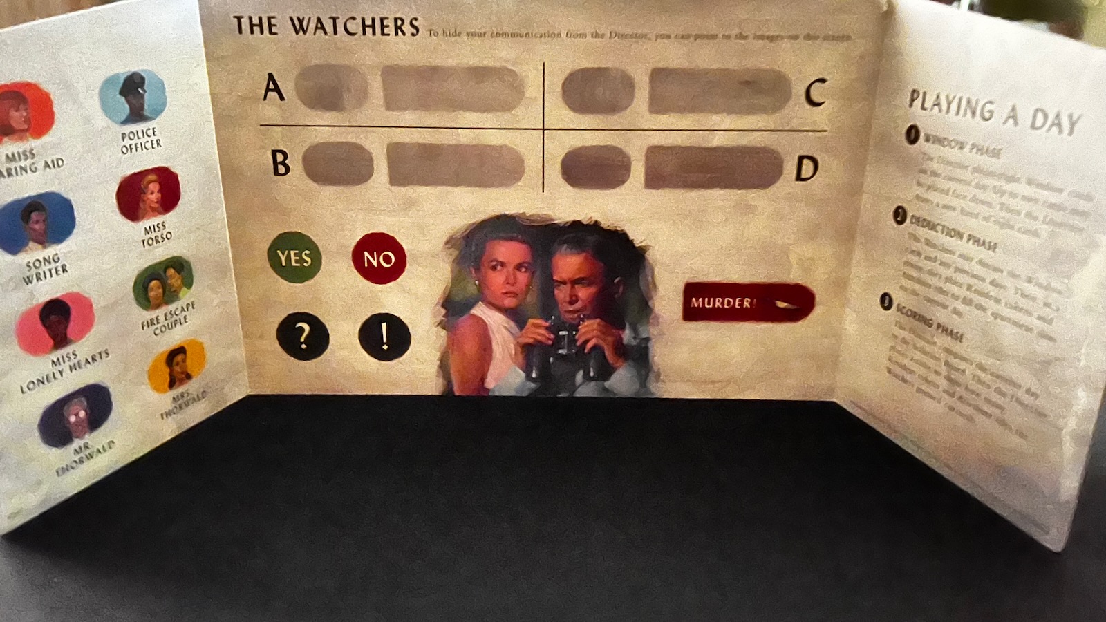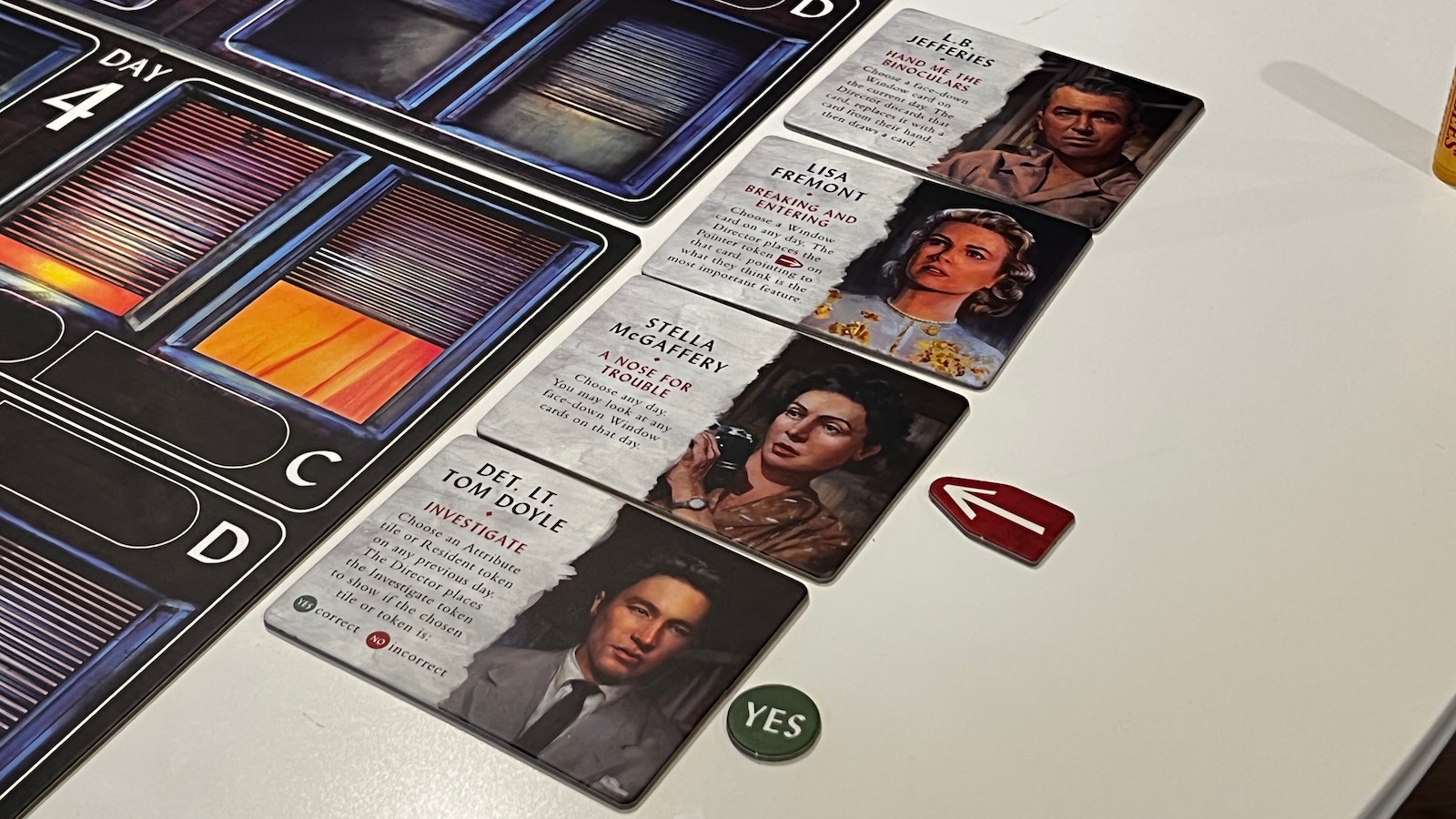 The players have a few helpers taken straight from the movie to assist them throughout the game that can each be used once. L.B. Jeffries, the protagonist of the film, allows players to discard a face down window card and have it replaced by the director with a new clue. Detective Doyle, Jeffries war buddy, allows players to ask if one action tile or resident token on any day is correct. The director must answer truthfully, even if his goal is to mislead the watchers. Lisa Fremont, Jeffries’ love interest played by Grace Kelly in the movie, allows players to select a card from any day for the director to place an arrow pointing out the most important thing in that photo. Finally, Stella McGaffery, Jeffries’ nurse, allows players to look at all the face down cards placed on a given day which comes in handy if the players believe the director is trying to deceive them…