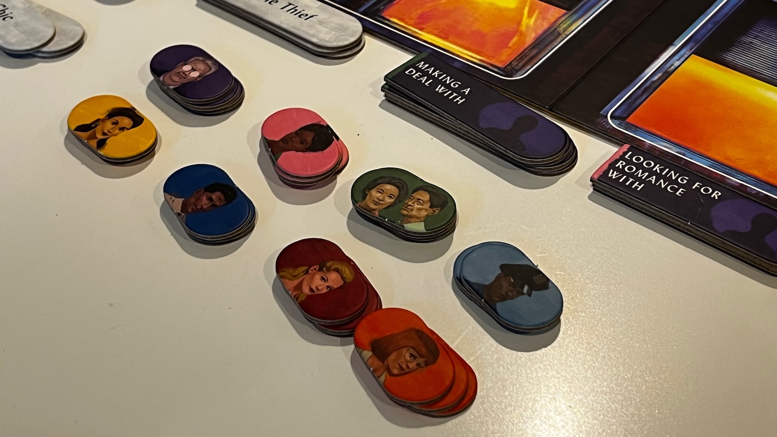 The gameplay is engaging from start to finish. Players get to choose the possible themes for each apartment and the conversations are deep and interesting. Players are dissecting every element of the cards while trying to interpret where the director is trying to lead, or mislead, them. The possibility that one of the tiles could be a Murder makes players second guess themselves quite often and the game we played ended up in an all player defeat because the director was apparently too “shifty.” Playing as the director is stressful when the cards you draw don’t help your cause. A misstep on a clue could raise the suspicion of the other players, even when a murder token is not in play. The director’s job gets all the more difficult when a murder tile is in play because they must still lead the other players to 6 correct answers, while trying to steer them away from the murderer. The game also provides a leveling mechanism with 8 tiles that require two resident tokens in order to fulfill that window. This ups the complexity for both the director and the players especially when both action and resident are needed on the tile to get the clue correct.