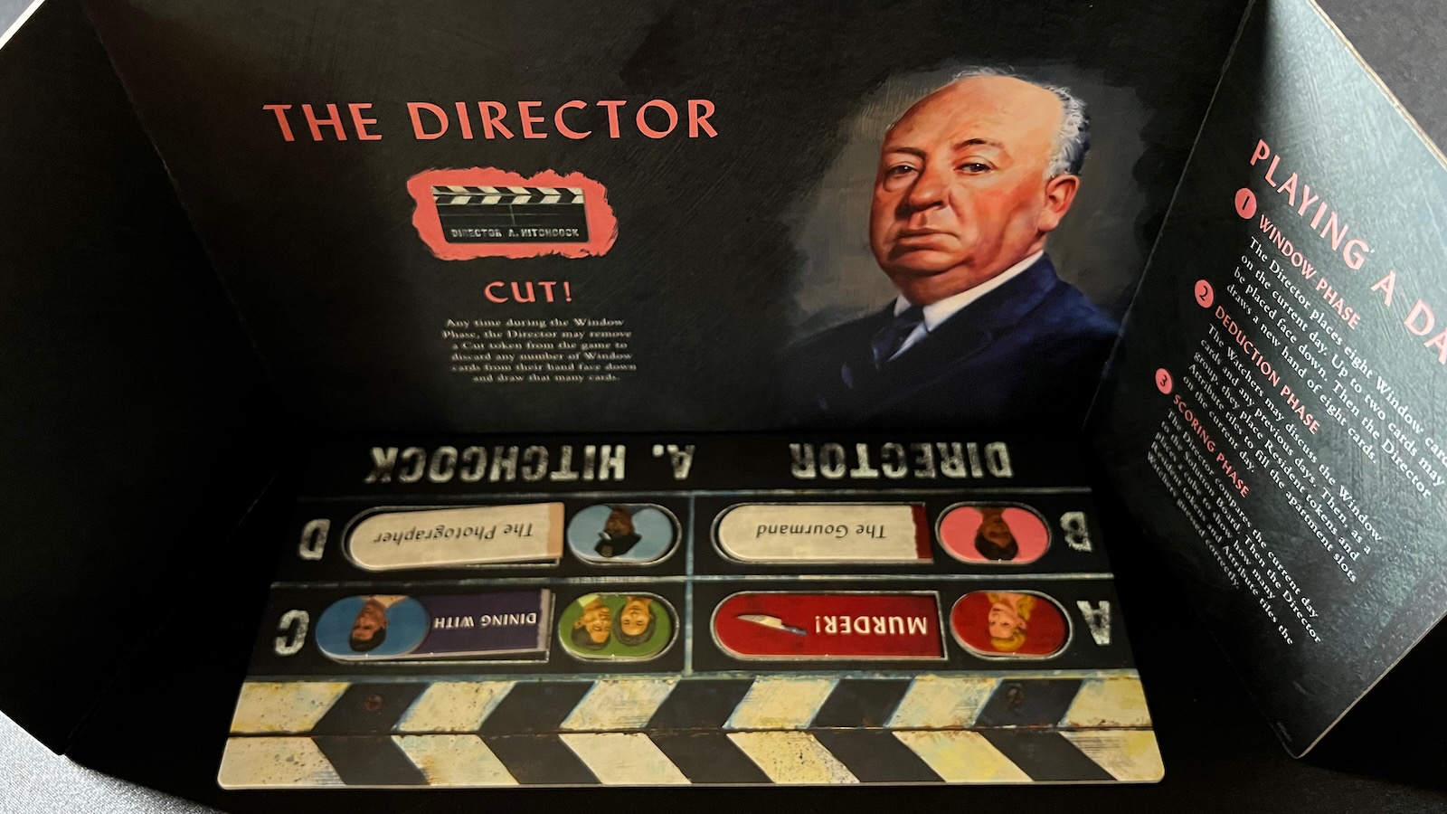 Have I been vague enough? Have I built up the suspense? Do you have questions about what I’ve been alluding to? While probably not worthy of Alfred Hitchcock himself, the answers are coming. In a normal game, players have 4 rounds to guess the director’s placement of all tiles on the director board. If this is not accomplished both the players and the director lose. However, if the “murder” tile was one of the placed tiles at the beginning of the game, the director is actually playing against the players. Throughout the rounds, the director tries to deceive the players with the placements of the window cards, however, to win, the director must get the players to guess 6 of the 8 placed tiles without guessing the murder tile. If this condition is met, the director wins the game. If the players can get 7 of 8 correct tile and token placements and guess the murderer in the last round, the players will win. If neither of these conditions are met, all players lose together.