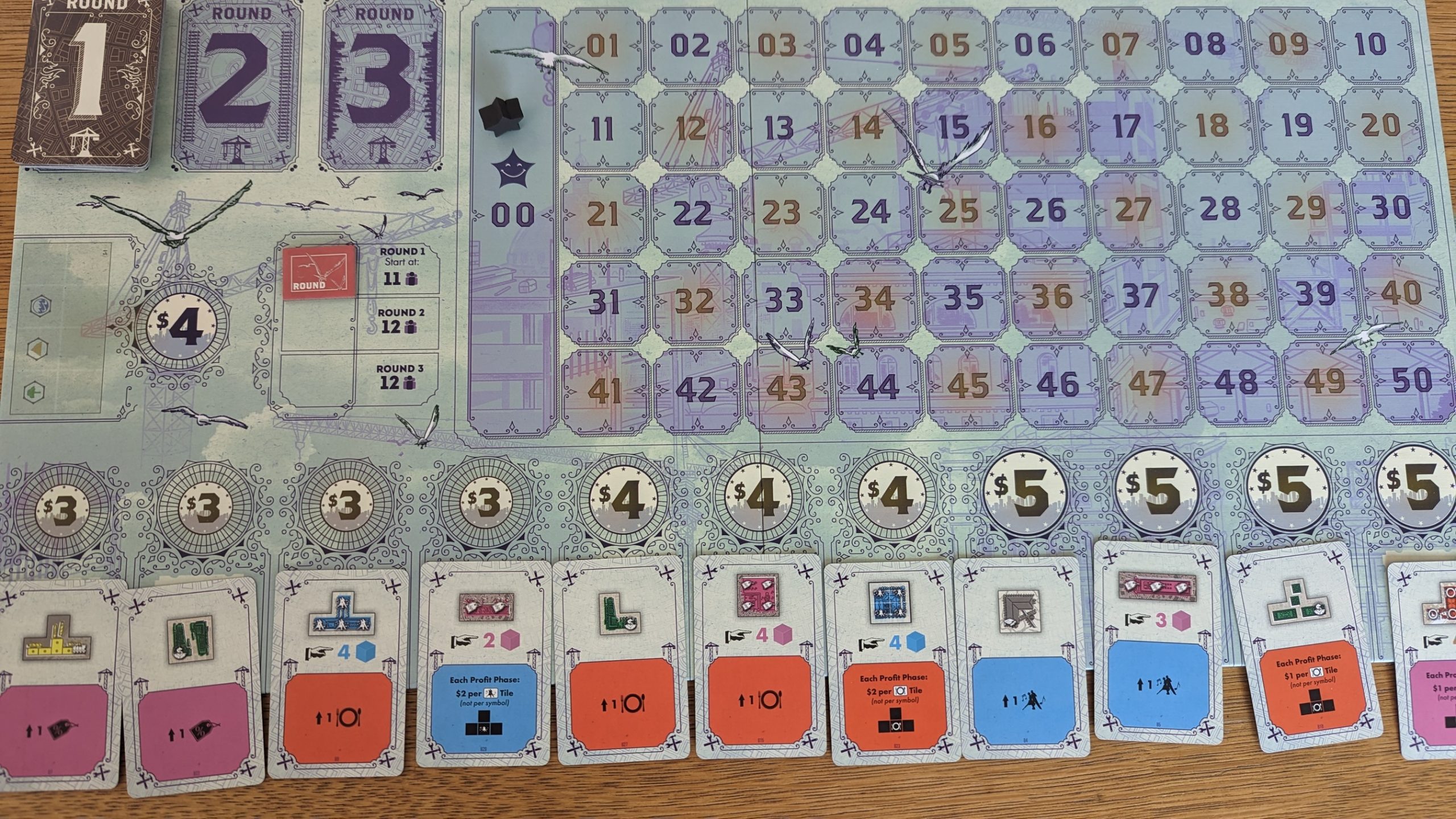 For all my praise, Rebuilding Seattle is by no means a perfect game. In fact, after just about every session I’ve played it, at least one of the players walked away with a critique. But the way I see it, everything that’s been brought up is either a minor nitpick, actually a boon in some circumstances, or both. The main board is definitely oversized, with the majority of its space dedicated to a score track that goes from 1 to 50 with no way to indicate lapping other than putting a money token under your scoring token in a game where final scores usually range within 30 points plus or minus of 100. Between that and the extra markets you add for 3 to 5 players, the game can get a bit of a table hog, and there were some arguably less than optimal graphic design choices made. On the other hand, between most scoring occurring at the end of the game and being forced into your own little corner, the game successfully obfuscates how well players are doing in relation to each other. Considering the huge chunks of points they represent, the imbalance between different landmarks does sometimes wind up being the deciding factor in who wins a game. But I’m honestly not too bothered by balance, I’m much more interested in the experience a game provides, and I still haven’t heard the end of my mom wiping the floor with me after both of her landmarks. Single-handedly scored more than both of mine combined. Who am I to say something that brings that much joy is a flaw?