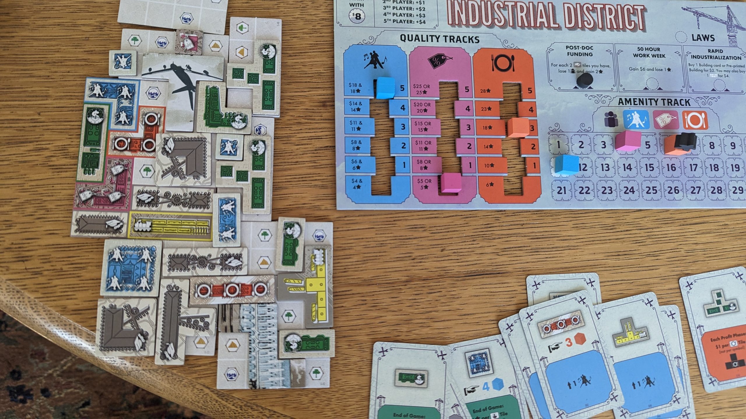 Deceptive simplicity is the phrase of the day here, and it starts with the rules. On their turn, players must take one of three actions. The most straightforward is enacting a law- once per round, players can resolve one of the three laws on their asymmetric player board. Purchasing will be the most common, which allows players to buy a card to add the building tile to their neighborhood and receive the card’s benefit, and/or pay $4 to add a suburb expansion tile to their neighborhood. All of this probably sounds like polyomino multiplayer solitaire to you, and it largely would be if not for the stroke of genius that is resolving events, the third action. The action cards all have a benefit for the player that triggers them along with an opportunity for everyone at the table. All but one are tied to a specific building- graduation lets you reduce your population for each of your schools, and expansion nets you a free suburb for each of your train stations. Each of the three amenities, entertainment, retail, and dining, has everyone score the corresponding quality track, minus the difference between your population and the number of that amenity’s icons you have in your neighborhood. The last event, nature’s impact, gives players a bonus for every nature icon in their neighborhood they haven’t built over depending upon the round. For example, in round 2, every lake will reduce your population by one, but then you don’t have to care about lakes for the rest of the game. Once the final event is triggered, the round is over, and the card markets are reset, making the end of every round just a smidge tense as you try to decide if you can afford to activate an event yourself, as it makes it all the more likely play won’t get back to you to buy that tasty card you’ve been eyeing. On top of that, depending on how everyone’s game is going, they’ll all want to personally activate certain events, or have other players activate them for them, all in a specific order. So yes, Rebuilding Seattle is very much a head-down low-interaction euro, except for when you care about the event cards, which is all the time.
