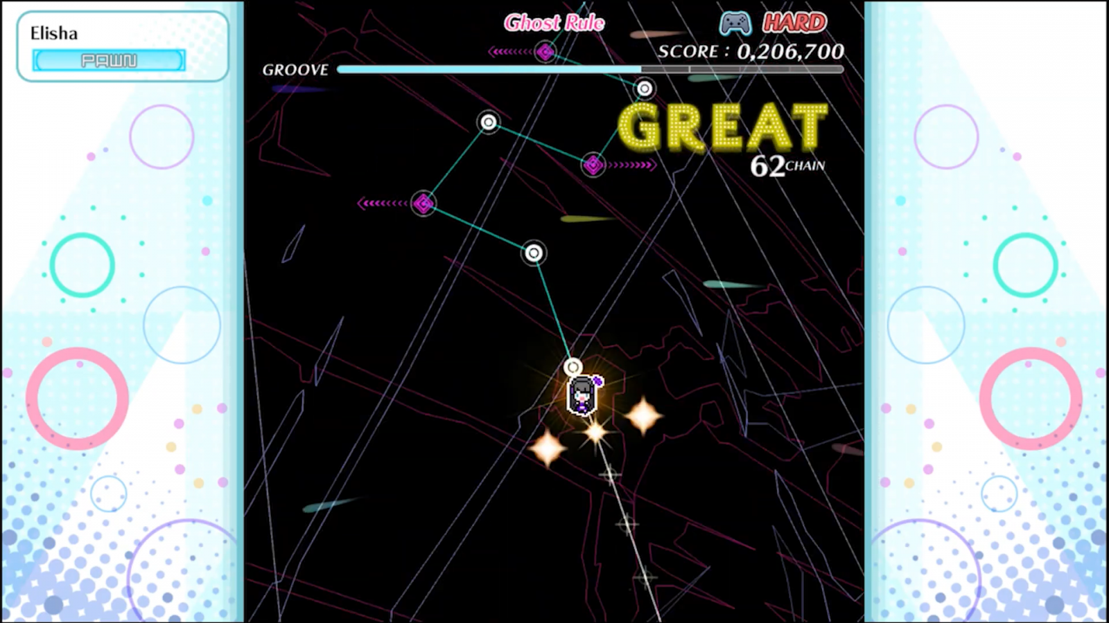 Pretty well, actually. Groove Coaster Wai Wai Party!!!! isn’t a perfect arcade port, but it does translate the controls well enough to be a decent alternative. The sticks are ported to the ones on a pair of Joy-Con (or a Pro Controller), and you can use both sets of face buttons to hit the beats as well. You can also use the analog sticks to hit beats too, making this a versatile control scheme. The Switch version also allows you to use two Joy-Con and use waggle controls to match arrow directions, which is totally not recommended for high level play, but is a nice addition for slower songs.