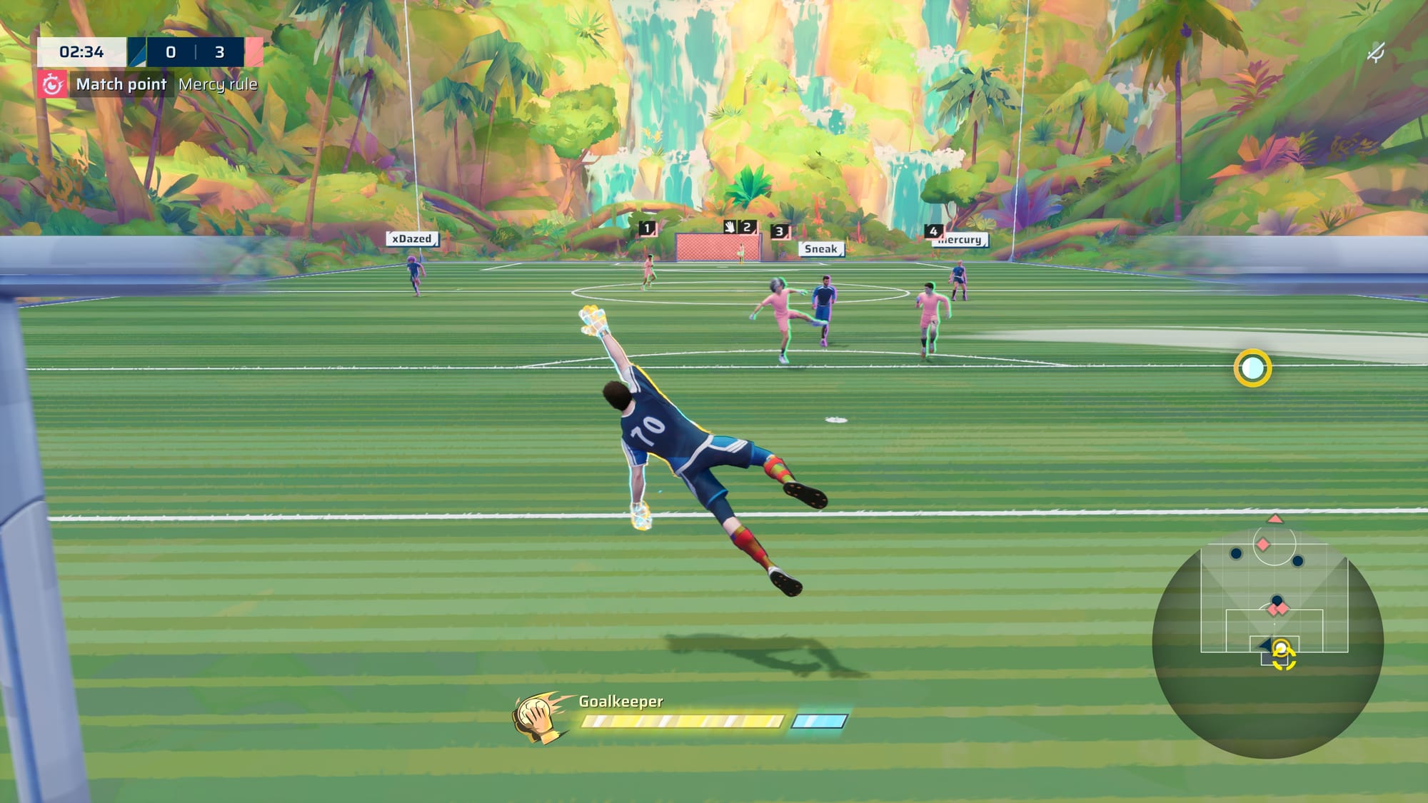 Your role in Rematch is positional in a dynamic way. You can literally step into the goal box to be given the gloves and take on the role of goalie. Should your team need you on the attack, you can peel out and assume the same role as non-goalie players. This lets you position yourself in the way your team needs most for the situation.