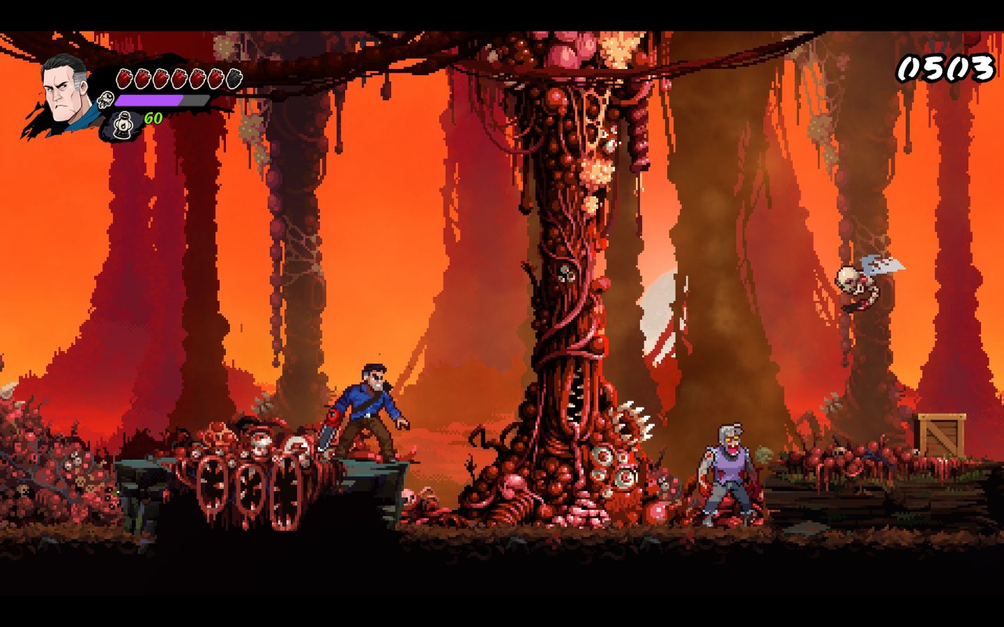 As expected, Ash Vs Evil Dead is sufficiently bloody, with Ash slicing and dicing his way through countless enemies as he chases after the Overlord. I found myself gleefully smiling as I caused chaos, all the while laughing at the fantastic background antics. When I stepped into the second world I immediately felt nostalgic, as it brought to life the infamous cabin in the woods along with new enemies and obstacles to overcome. Later levels visit a few more recognizable locations, all while throwing a few hilarious enemies at you that fans of the movie series and TV show will recognize, which I won’t spoil here.