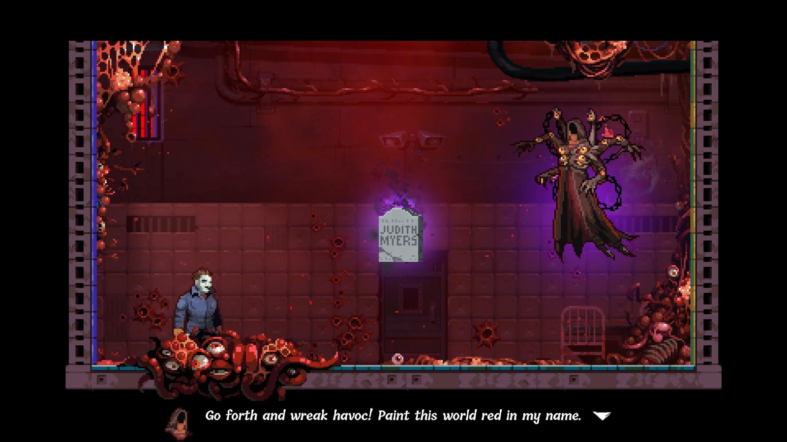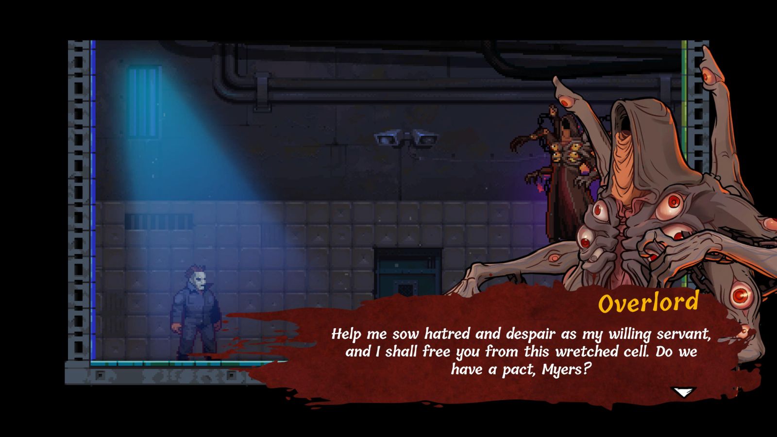 It helps that RetroRealms isn’t tied to the original story, but rather utilizes the movie series to serve as inspiration for various levels and bosses, while telling its own story. The game begins with Michael Myers sitting stoically in a cell in Smith’s Grove Sanitarium (I mean, how else would Michael Myers sit?) as chaos erupts outside his door. Soon he learns the cause of the chaos, as he is visited by a mysterious being known simply as the Overload, who tasks him with sowing hatred and despair in his name in exchange for being released. Michael, ever the wordsmith, responds by staring blankly. Not one to let silence deter him, the Overlord decides that Michael’s silence serves as an adequate agreement and bestows upon Michael his iconic knife, along with the ability to enter into the Nightmare Realm at will and sends Michael on his merry way to wreak havoc.