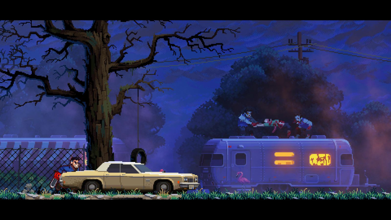 Next I booted up Ash Vs Evil Dead, ready to grab my boomstick and chainsaw and tackle some undead hordes. Again, RetroRealms did not disappoint. Ash Vs Evil Dead begins with Ash enjoying a nap in Mossy Haven Trailer Park, when he is rudely woken up by the Overlord, intent on obtaining the Necronomicon. Ash refuses, forcing the Overlord to steal the book and run off, but not before dropping an eyeball capable of allowing Ash to invoke the Nightmare Realm. Ash grabs his chainsaw and shotgun, and takes off in chase of Overlord, determined to retrieve the Necronomicon.