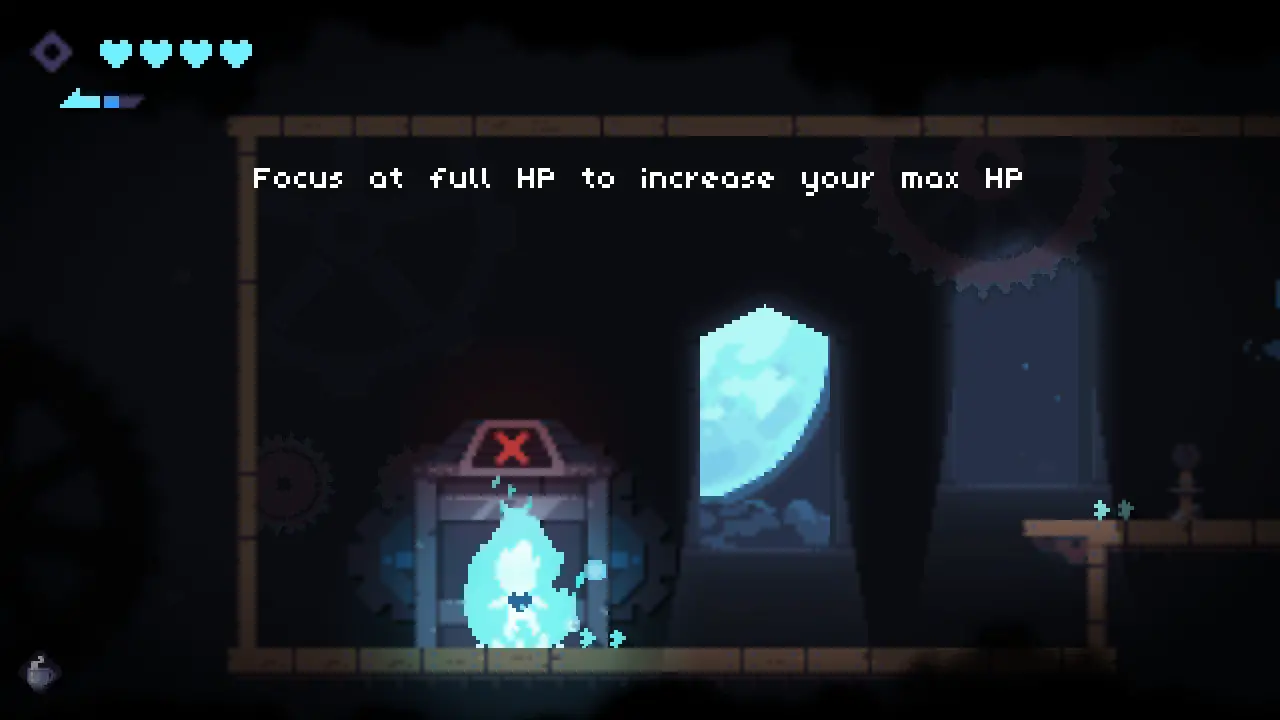 There are many different enemies you will encounter along your journey. Some are able to fly while others may scoot and scuttle on the ground. There’s even some that scale the walls. They will come equipped with different attacks, such as shooting little fireballs at you or even tackling you. You will need to use your platforming skills to avoid attacks and take them down as quickly as possible to avoid losing too much health. You don’t regenerate health in this game, although there is a way to recover it. Every enemy you defeat drops souls that you can collect to fill up a meter. Once a segment in the meter is full you can ‘focus’ to get back half a heart (basically you go Super Saiyan). The feature also allows you the increase beyond your max HP (4 hearts) if you get enough souls. However, this is still a finite resource, so you still have to take care to safeguard it if you want to make it to the end.