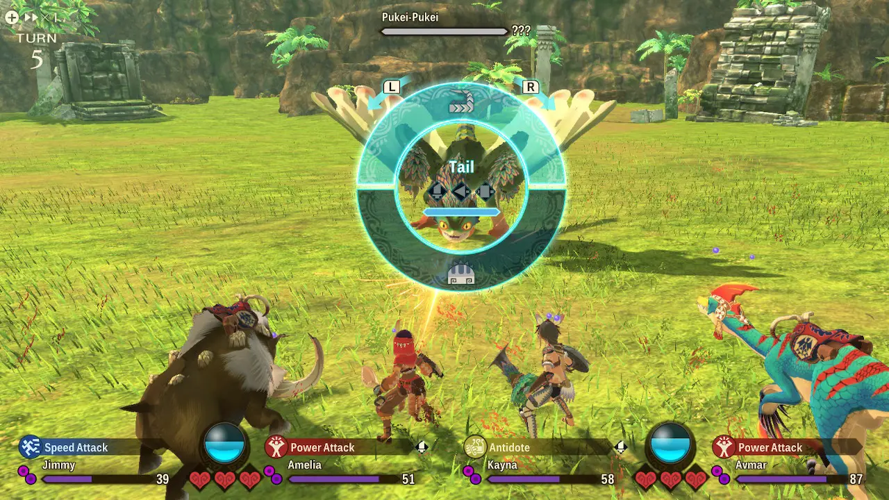 Battles in Stories follow the Rock Paper Scissors formula. You have three types of attacks: Power, Speed, and Technical. These are colored Red, Blue, and Green respectively with Power beating Technical which beats Speed and so on. Monsters aren’t weak to these attacks, instead they have a tendency to use one type over the others. If you and a monster both attack each other in the same turn, you’ll engage in a Head to Head with the winner determined by this Rock Paper Scissors dynamic. Whoever comes out on top in this clash will deal more damage and take less in the exchange, so you need to observe your opponent’s patterns and correctly predict their next move to live to fight another day.