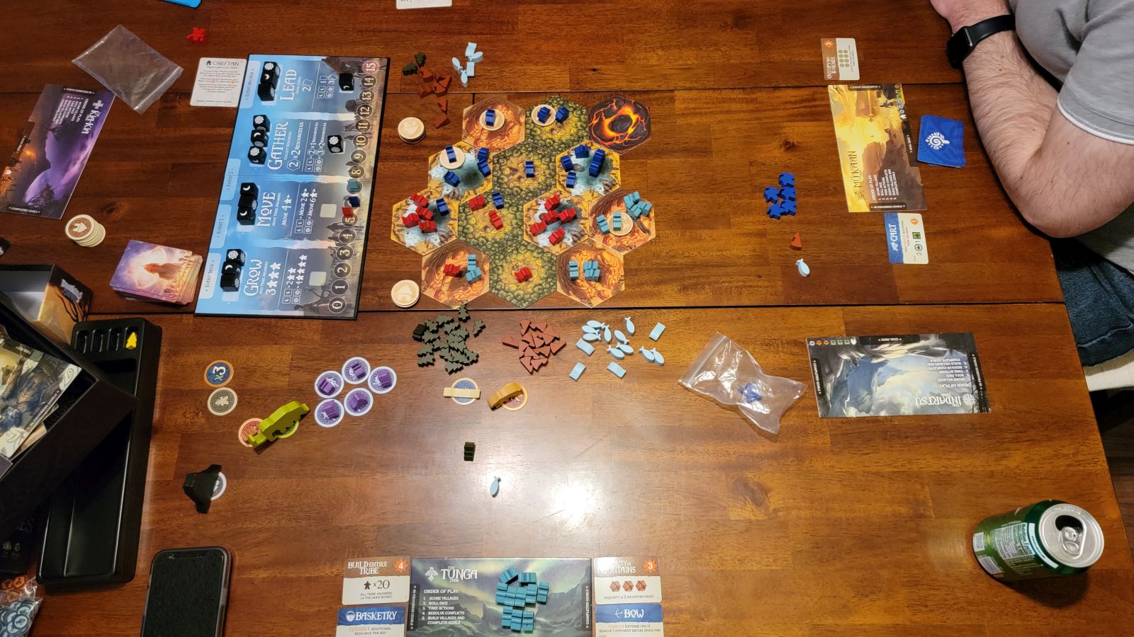 Across the four actions, Grow, Move, Gather, or Lead, each player will ultimately affect the strength of the action for the next player all the way through the end of the game. With this understood a typical turn in Rise of Tribes involves taking two actions. This involves placing more of your tribesmen on the map(Grow), moving your tribesmen around the map(Move), gathering resources from multiple hexes(Gather), and drawing cards from your own personal deck(Lead). After two actions are taken then players check and resolve any conflicts that have occurred. Finally players will build villages and complete goals.