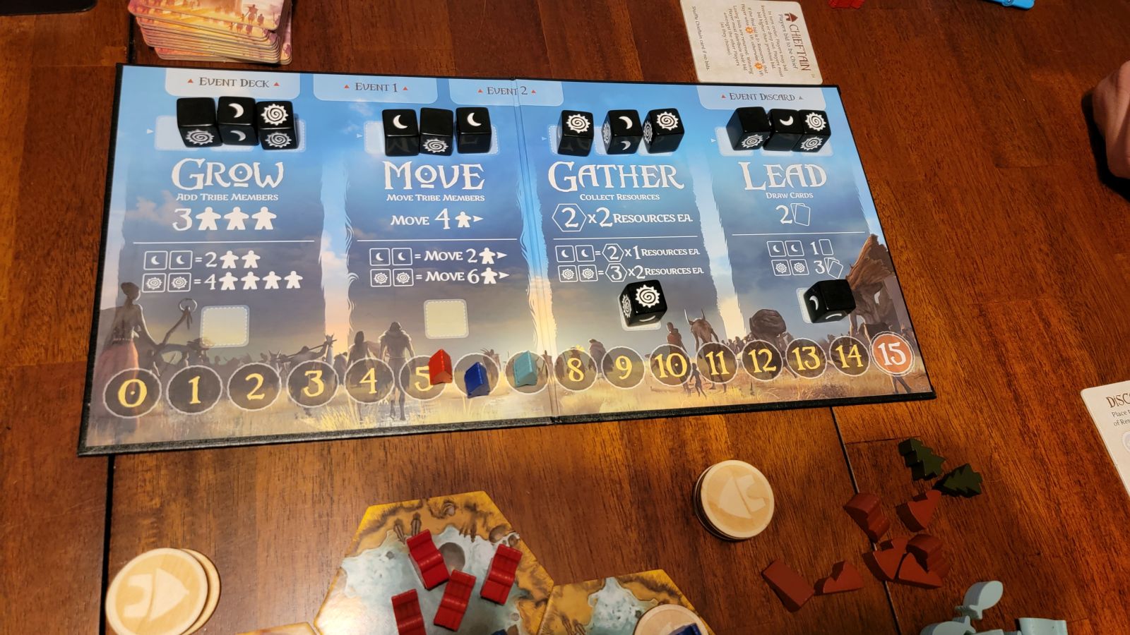 Next is the lead action. Leading allows players to draw one, two or three cards based on strength of the action. These cards are goals that either give players bonus abilities or or action as missions to work towards in order to score points. These points here are how the game flows and ultimately ends. When one player reaches 15 points the game ends and that player is declared the winner. Points also get scored by players that have built villages and if those players have villages alive at the beginning of their turns, not unlike upkeep except in this scenario you score points for each village you have built that is still alive. Here is where players want to move into territories with others and force them to lose tribesmen and villages or else they risk players running away with the game.