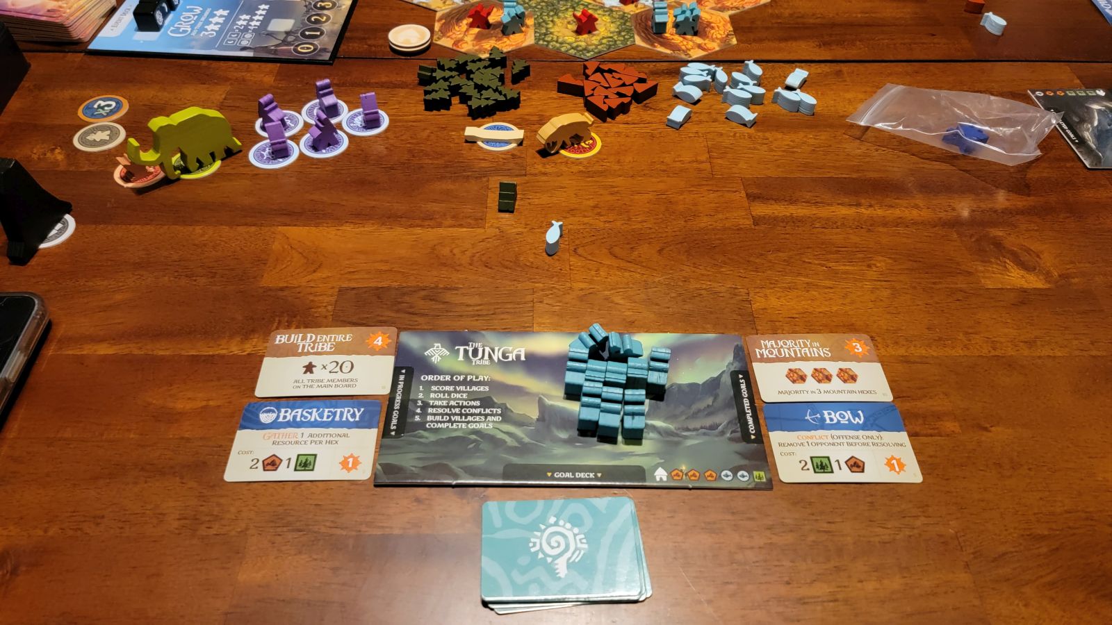 There are a few things here to unpack. First, conflicts occur when more than five tribesmen are in the same hex regardless of which player they belong to. Next in turn order, one by one players remove tribesmen from hexes until either all tribesmen are removed or there is one tribesmen left on the hex, meaning that player had more on the hex to start or moved more in to overpower the player originally in a hex. So instead of your typical battle for area control type mechanisms, here we get players needing a majority to have/keep control of hexes after a conflict.