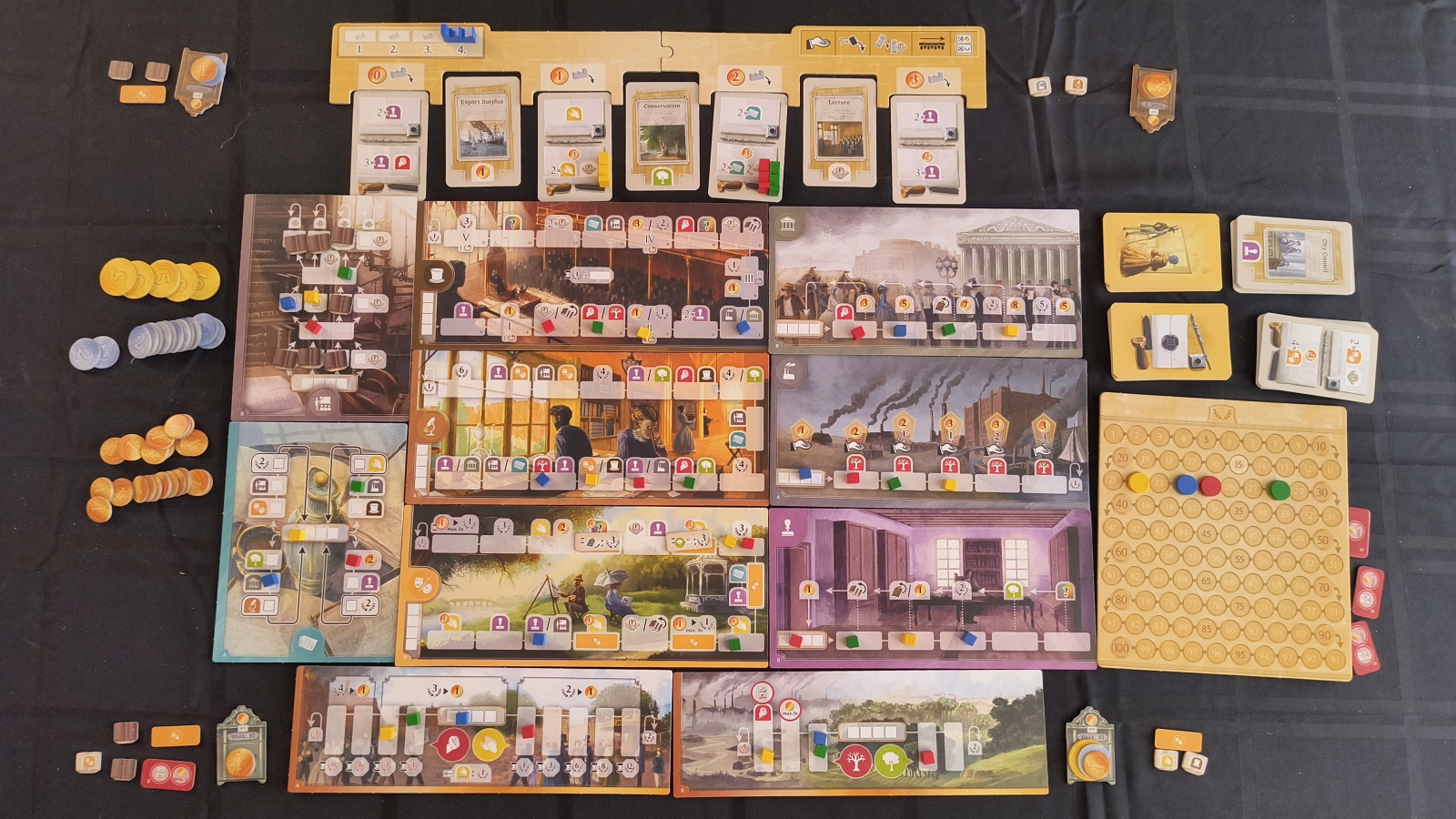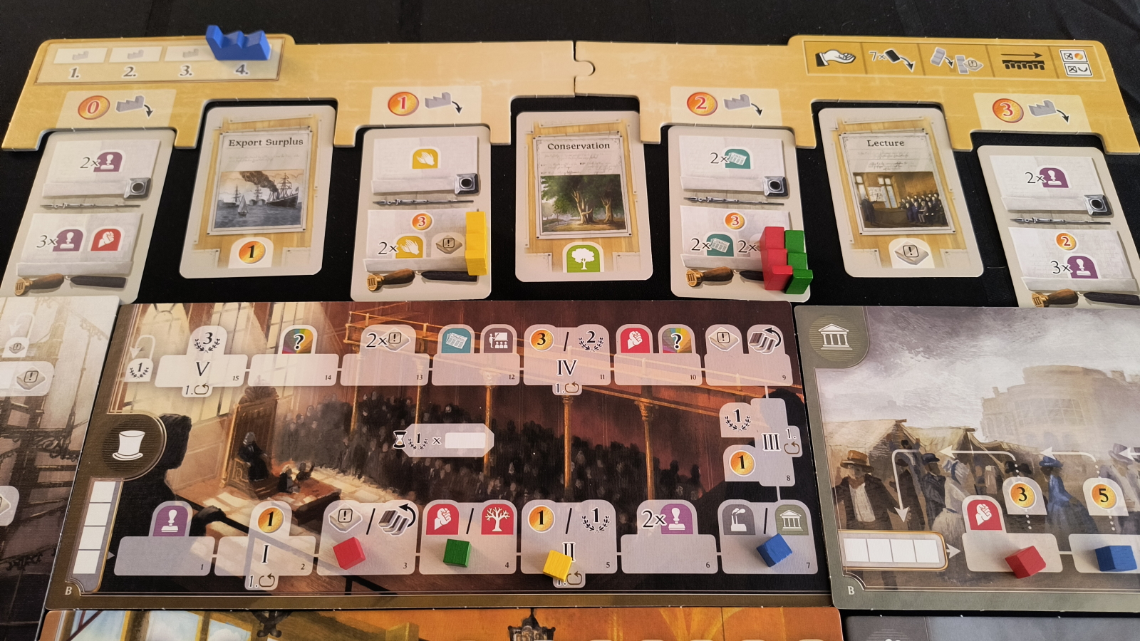 Rise puts players in the shoes of aspiring industrialists during the Industrial Revolution. Up to 4 players compete to have the most points, earned by increasing their status on the aforementioned tracks. There are 3 core tracks (politics, science and culture), 3 economic tracks (industry, banking, and bureaucracy), 2 status tracks (popularity and environment), 2 others (education and press), and finally a victory points track. Each space on these interacts with other tracks and other parts of the game, except for the victory points track.