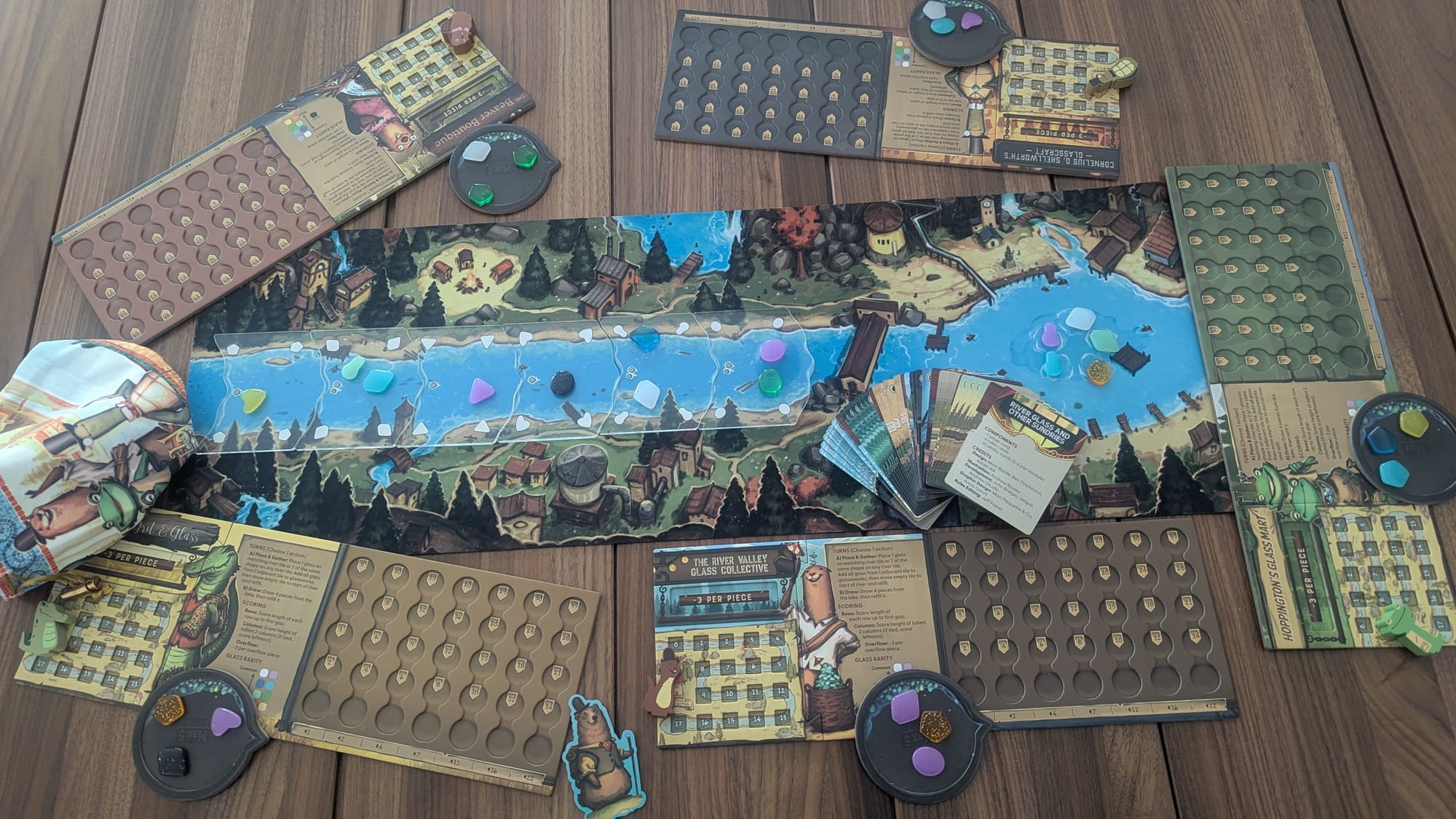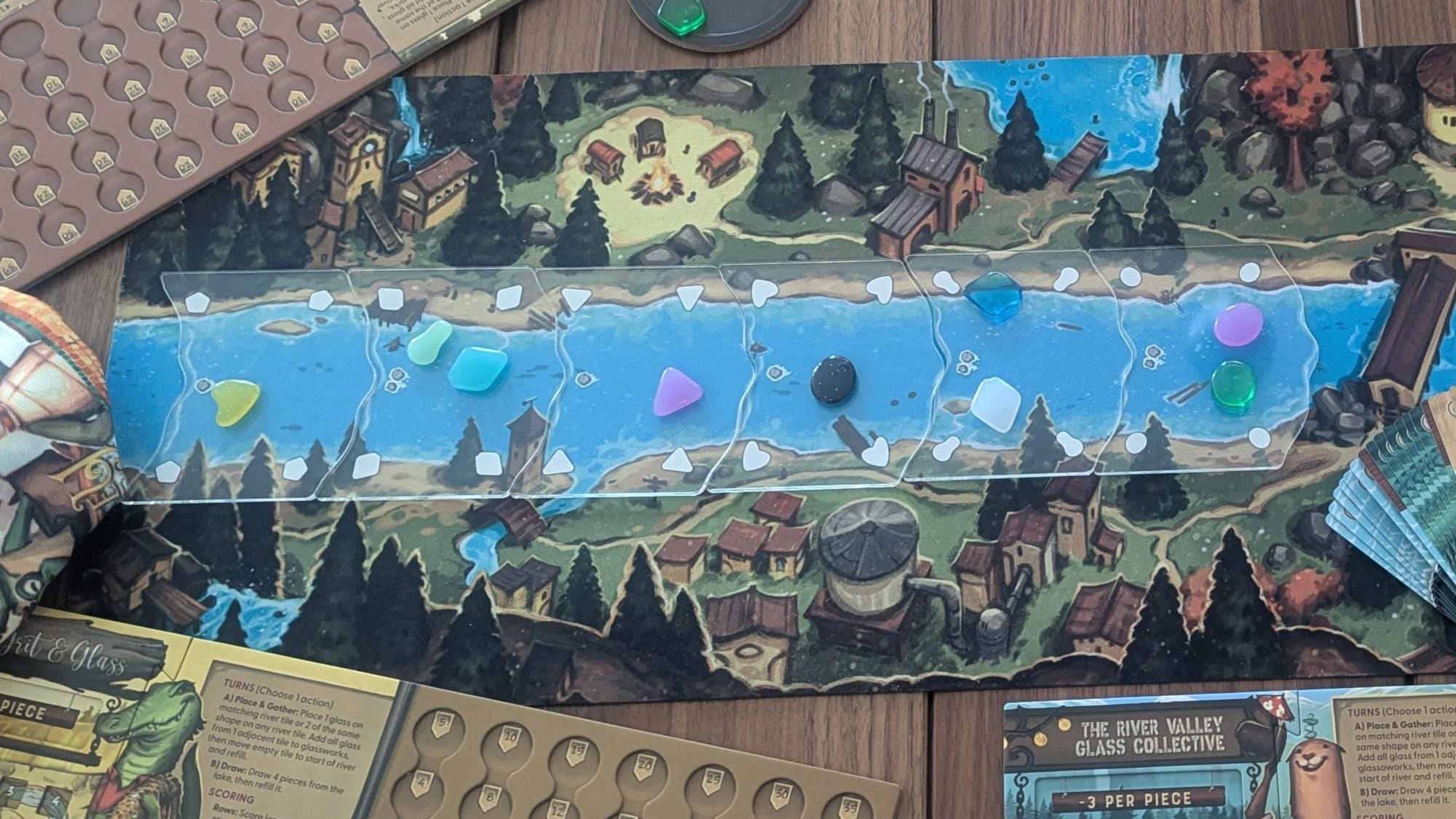 There are two different versions of River Valley Glassworks available: a standard and deluxe edition. I have the deluxe edition, but I do not feel like you need to have the upgrades. The components for every version of this game ooze charm. The individual animals on each player board are pure charisma. The deluxe edition comes with a neoprene playmat to replace the cardboard main board, clear acrylic river tiles, a larger bag for the glass pieces, dual-layer player boards, and screen-printed meeples. Out of these upgrades, I only feel that the dual-layer boards add to the playability of the game. The neoprene playmat is nice, but it struggles to fit neatly inside the box and doesn’t sit quite flat when unrolled. I love the artwork on the screen-printed meeples, but they tend to fall over and lose their spot. (This can happen with the regular boards too.) Overall, the deluxe edition is nice but overkill.
