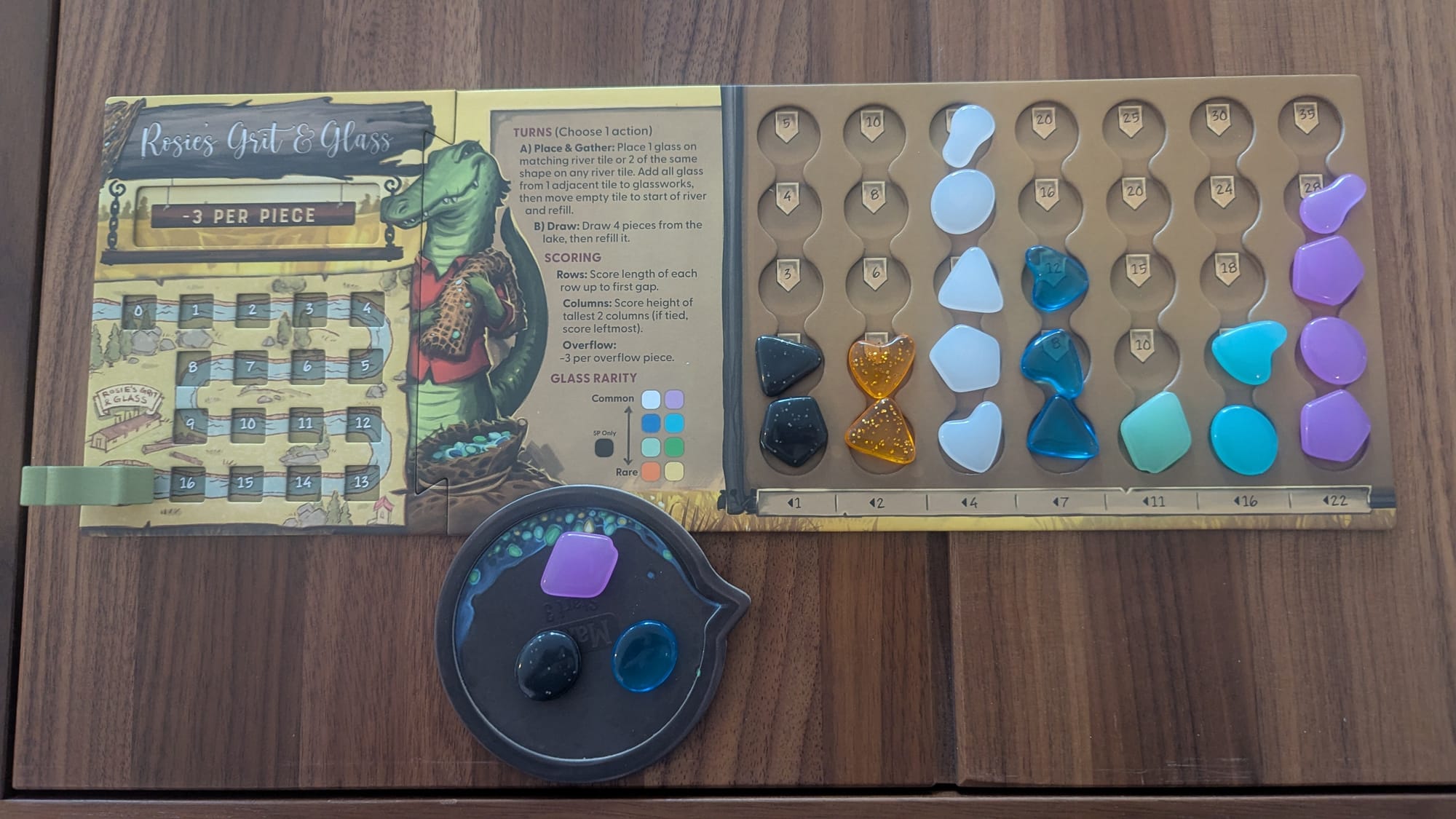 River Valley Glassworks' mainboard is the river filled with glass of various shapes and colors. On your turn, you choose a glass piece from your pan and place it on one of the five river spaces with a matching shape. You then choose an adjacent space and take all of the glass pieces. The river is reset with new glass pieces, and you will add the glass to your player board. Here is where the color of each piece comes into play. Your player board is made up of columns and rows worth points depending on their position. You’ll add new glass colors from left to right and add already existing glass colors from bottom to top. Getting a variety of colors is worth lots of points, or do you try to maximize only a few colors for those points instead? This puzzle is the heart of River Valley Glassworks.