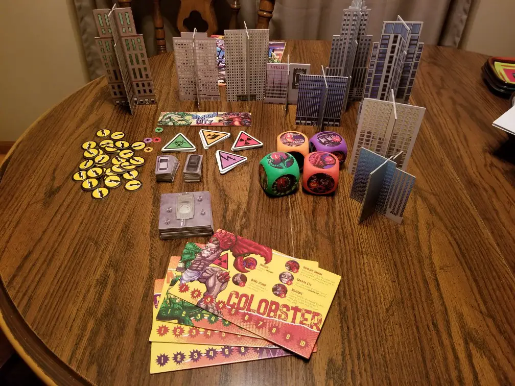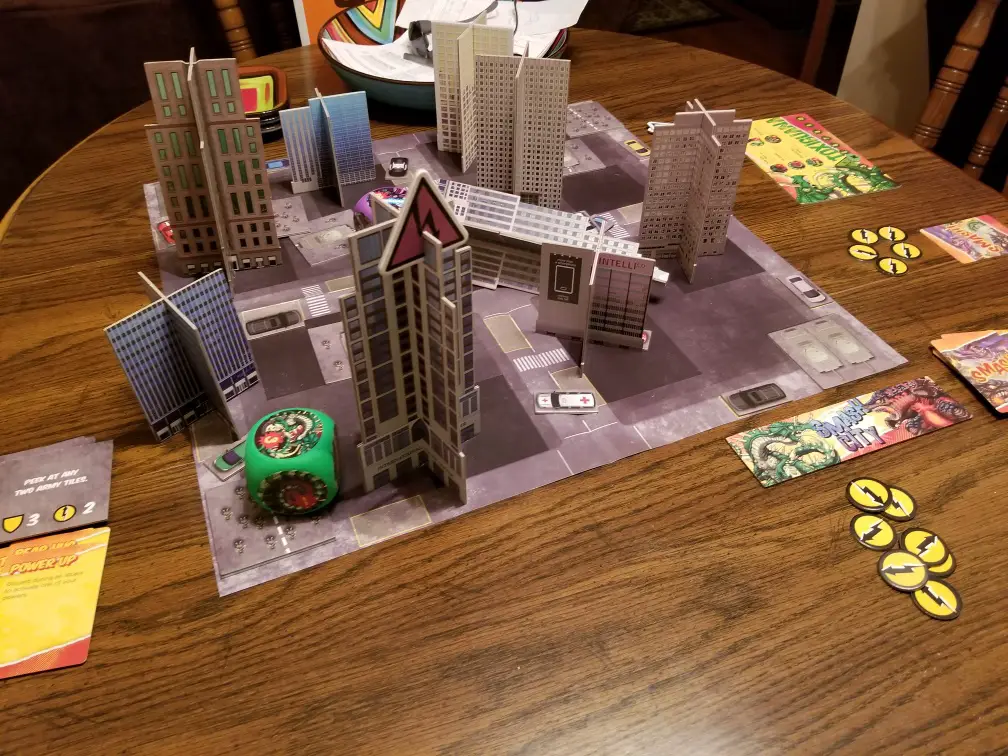 The designs of the set pieces are well-done and it doesn’t take long to set the city up. It does a fair job at creating the city aesthetic without requiring much effort from the players. As for the dice, they were much softer, bouncier, and lightweight than I had expected. After playing, I realized how much thought was put into them; the creators guaranteed that you couldn’t cheat when rolling these dice. Even holding a die an inch above the table and letting it go caused it to bounce off to the side and roll. As for gameplay itself, it takes some time to get used to balancing the strength required to knock down the buildings without flinging the die out of the city. The shorter buildings are harder to knock over, which is a bit of a bummer. Even so, Smash City is an interesting game that lets you live the fantasy of being a massive monster rampaging through the city, even if it’s only in dice form.