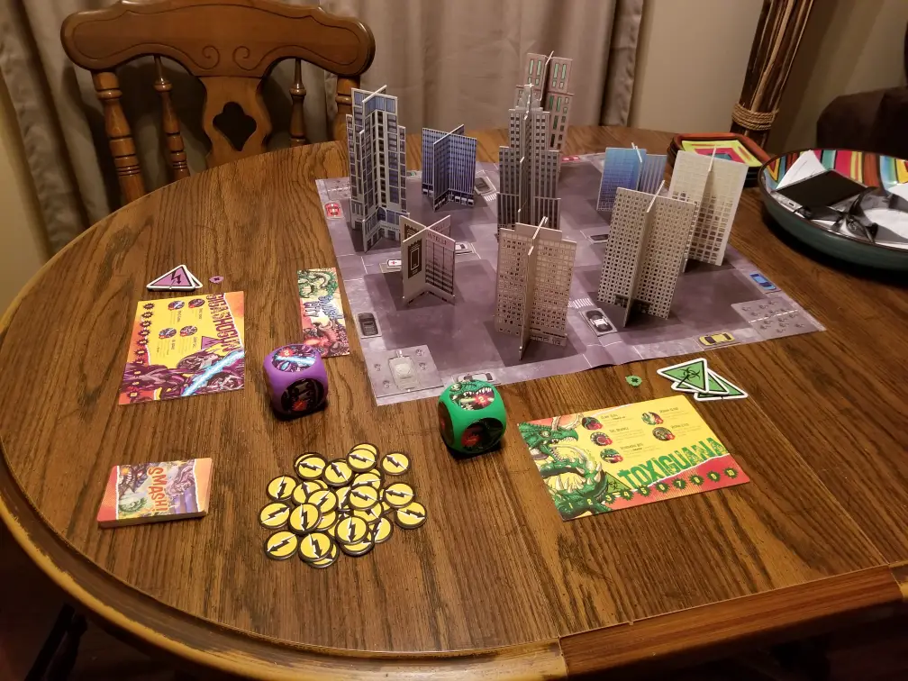Besides the attack, you may be able to activate a special effect based on the attack and the current situation. You can activate your attack’s special effect before or after attacking, which is pretty cool. Sometimes it’s better to use the effect first, while other times it’s better to wait until after. For example, GigaShogun’s rocket punch allows him to toss a car, while Magmaladon’s flame breath allows him to place a fire symbol on any building and attack a nearby army tile. There are some neat effects, but some are clearly way more useful than others. Once the turn is done, the current player grabs an army tile and places it anywhere they choose in the city. This represents the army calling in reinforcements as a result of your monstrous rampage. One thing I want to mention is that the game doesn’t clarify what you’re supposed to do with the buildings after the turn ends. We assumed that we were supposed to pick them back up for the next turn, but we added our own twist to it. Instead of moving them back to their original area, we stood them up wherever they had been pushed to. This way it kept that feeling of a city being warped by monster attacks.