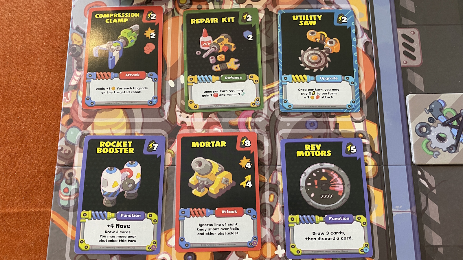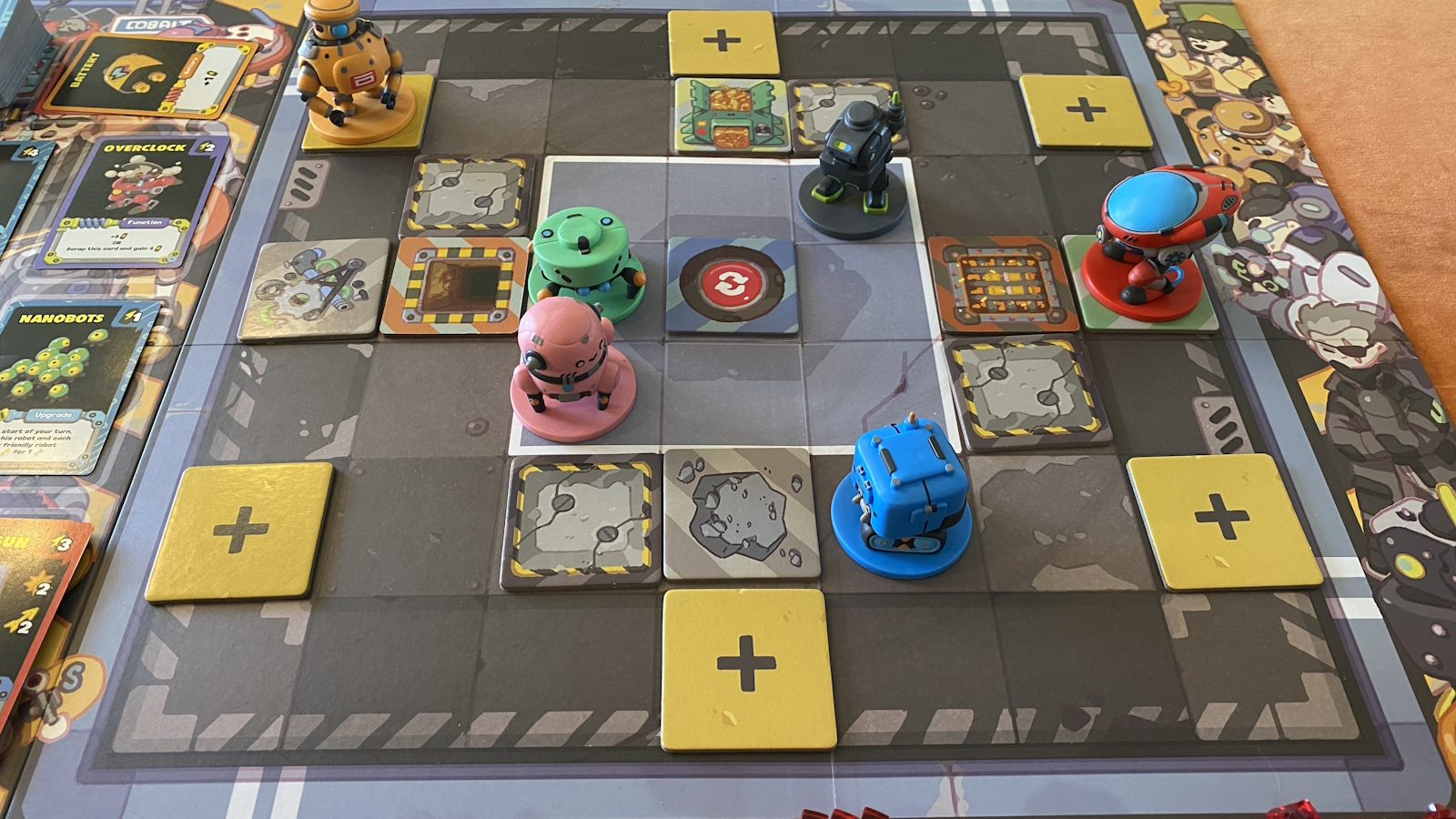 When playing with only two players, each player will control two robots with a single deck. Each card played gets assigned to one of your robots. This makes it very easy to manage, but causes some other issues. Energy and cards are universal, so you can have one robot just sit on a special income tile while the other goes to fight.