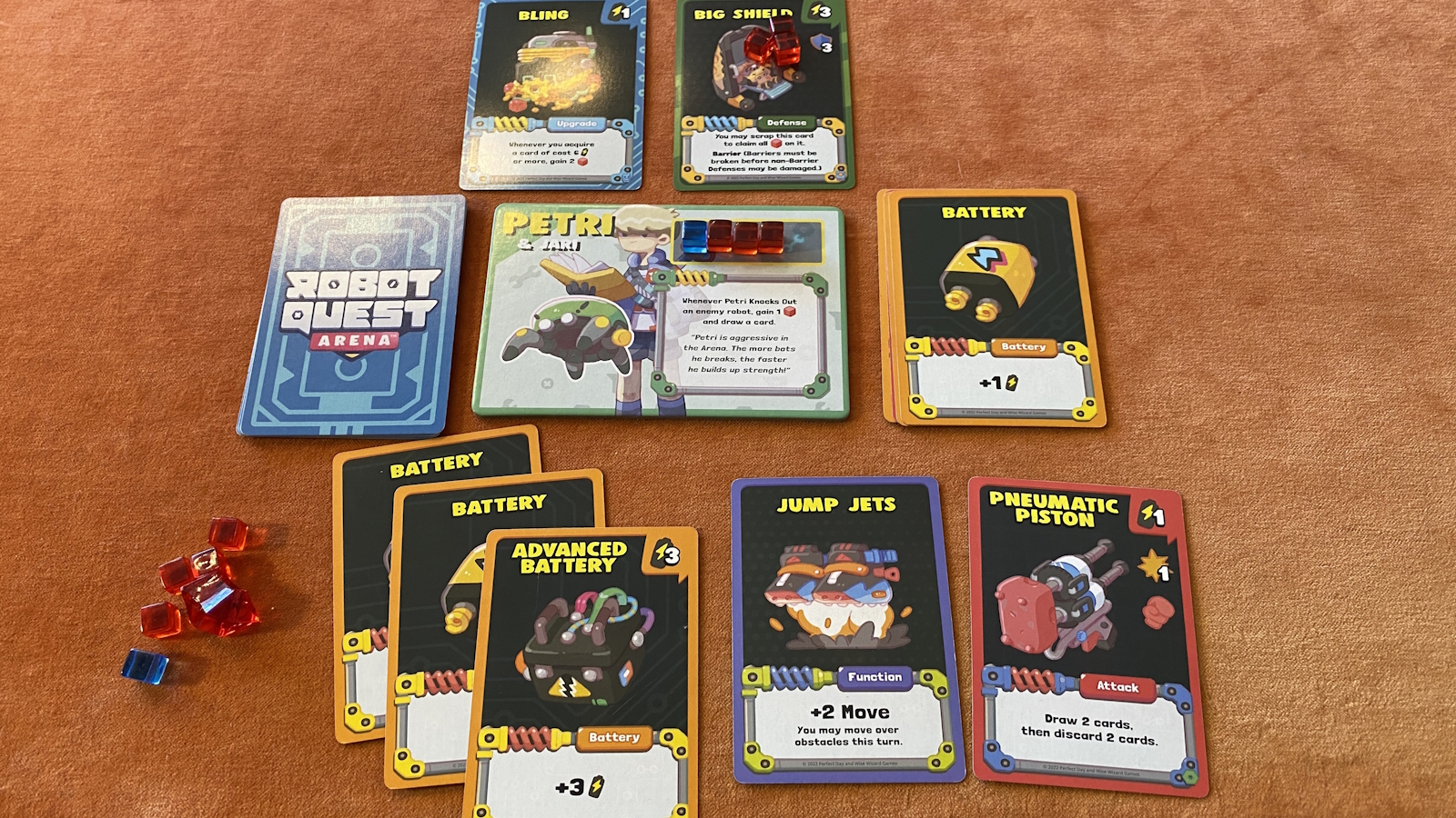 Players use energy that they generate from cards to either move around the arena or purchase more powerful cards. Attack cards are used to deal damage to opponents. All damage dealt is converted directly into victory points, with a little bonus for landing the finishing blow. Robots respawn at the beginning of the player’s turn, so getting knocked out never removes you from the action.