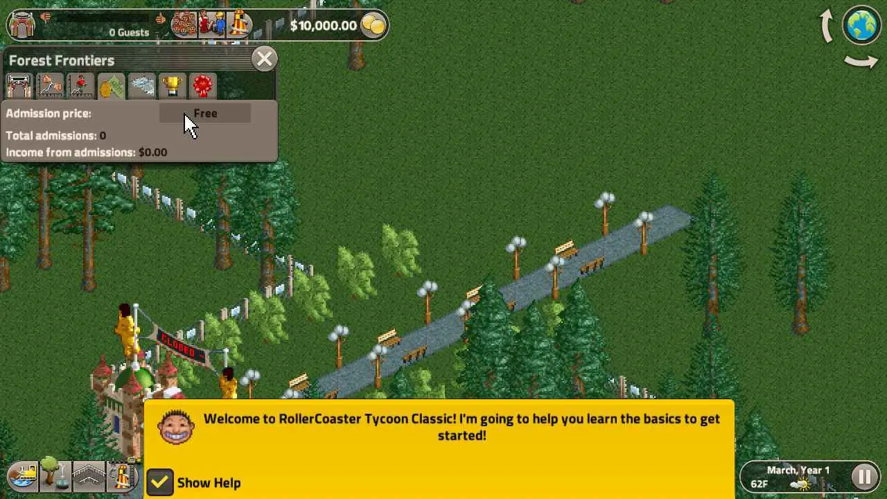 Prices are a very fickle beast. Over time, the value of rides will depreciate even if they are popular with guests. Eventually, guests won’t want to pay a dollar fifty for the haunted house ride so you will need to drop the price, therefore lowering the amount of profit it can bring you. There are a lot of intricate systems on play and a lot of them you’ll discover as you play through the tips. Normally loading screen tips are not super helpful or can outright make the player feel like they’re being talked down to but for a game as intricate as Roller Coaster Tycoon with dozens of unseen moving parts, no pun intended, it really helps add to the experience as you learn new techniques such as how weather will affect certain guests or rides, how prices can change the flow of your Park, and so many others. What’s great is that the select button gives you an options menu that lets you turn off those features if you so desire.