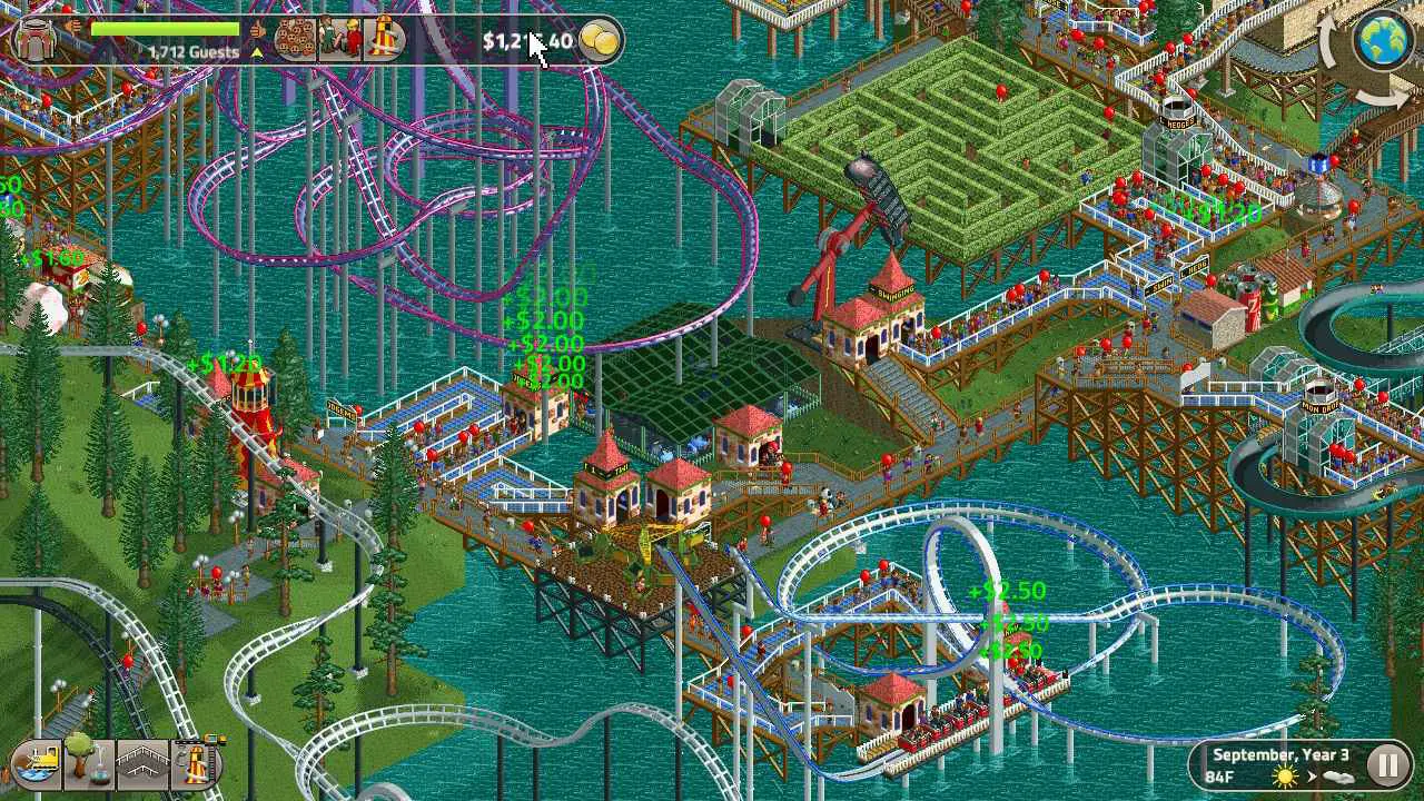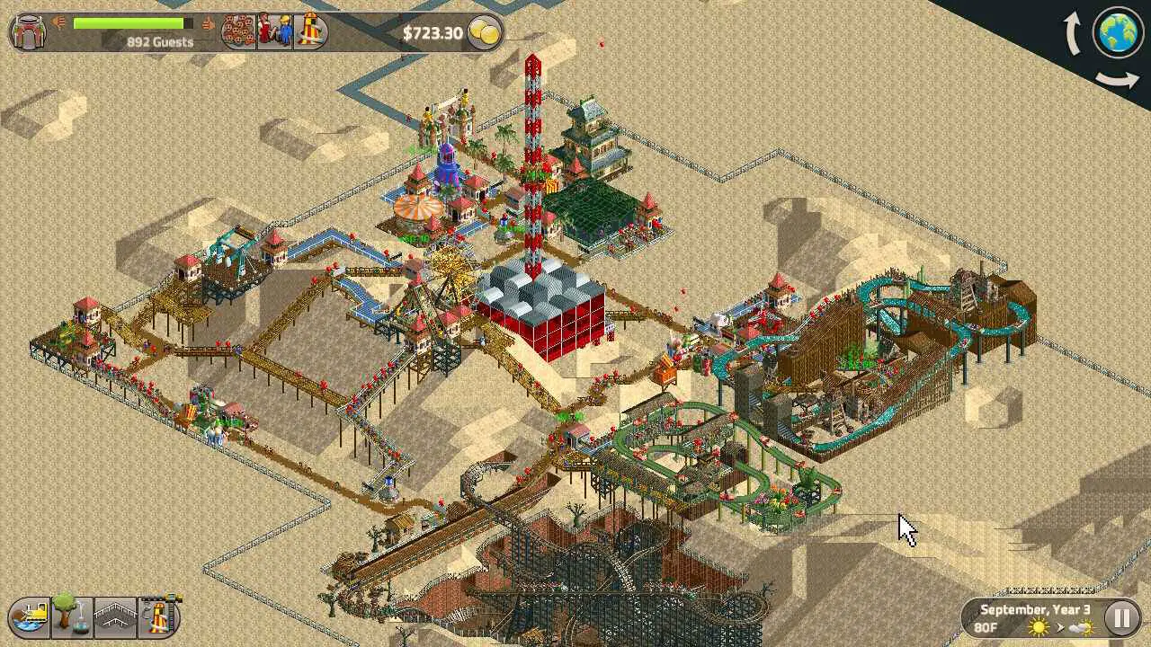 As you chip away at the dozens of challenge maps they have in the game, you’ll learn the tricks and trades of managing your theme park in Roller Coaster Tycoon Classic. One of the early challenge maps, Dynamite dunes, gives you a really sick roller coaster up front and your goal is just to expand the park with new rides and reach a certain amount of value and guest numbers by a certain date. I was able to make a dope park with the standard fare of Ferris wheels and twisting rides while also adding something that would be a little more unique for a park in the desert, a water ride. Even during the summer months when it’s 89°F/31°C, I ran a promotional campaign for free drinks in the park. There are a lot of creative ways to increase your Park’s value and guest numbers.