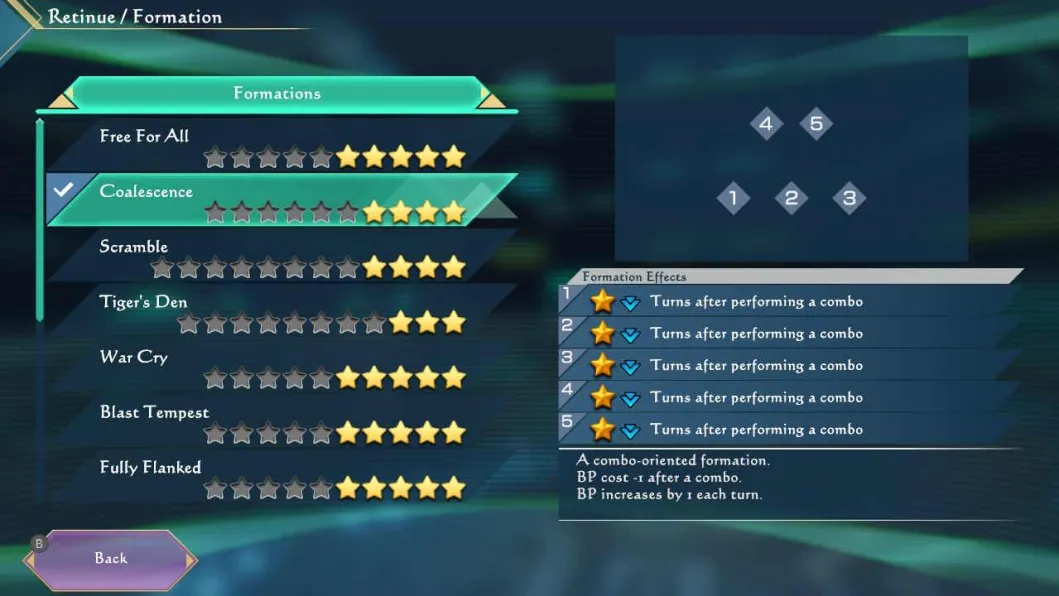 The other big combat addition is formations changing. These formations change not just where the characters are on the field of battle, but it also changes how many stars (Battle Points) you have to do attacks and the before and after effects of your attacks. I found myself using Coalescence for the majority of Tsunanori’s playthrough and War Cry for most everyone else in general. These are fun to play around with, but some lead to some rough battles and no stars to do heavier attacks.