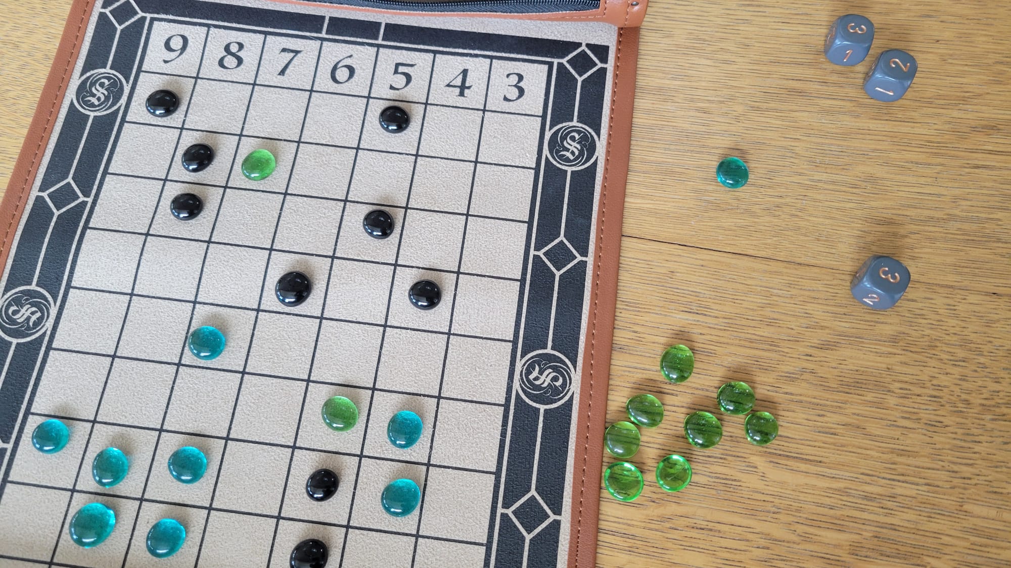Sage Stones plays as the lovechild of Go and Sorry!. On their turn, players roll 3d3, drop one of their stones in the column of the sum, and return an opponent’s stone they've flanked, with a final objective of dropping all your stones onto the board. Flanking lines work orthogonal, diagonal, and wraps around the edges of the board, which introduces a minor pain point since continuing a diagonal through a wrapped board isn't exactly a snap read. I understand that it was necessary from a design standpoint to prevent congestion at column endpoints, but it still merits mentioning. The real pain point is the gain/lose a turn mechanic, where players drop an extra stone if all their dice have the same result and don't drop any if they're all different. Readers who remember enough of high school statistics will be able to calculate this as a pretty sizable 2/9 chance of not having a turn. Since turns are really fast, it's not that big of a deal at lower player counts, but when there's five other people sitting around the table, you're pretty much guaranteed that someone else will have hit triples and you'll have lost a lot of your board position while you were sitting on your hands.