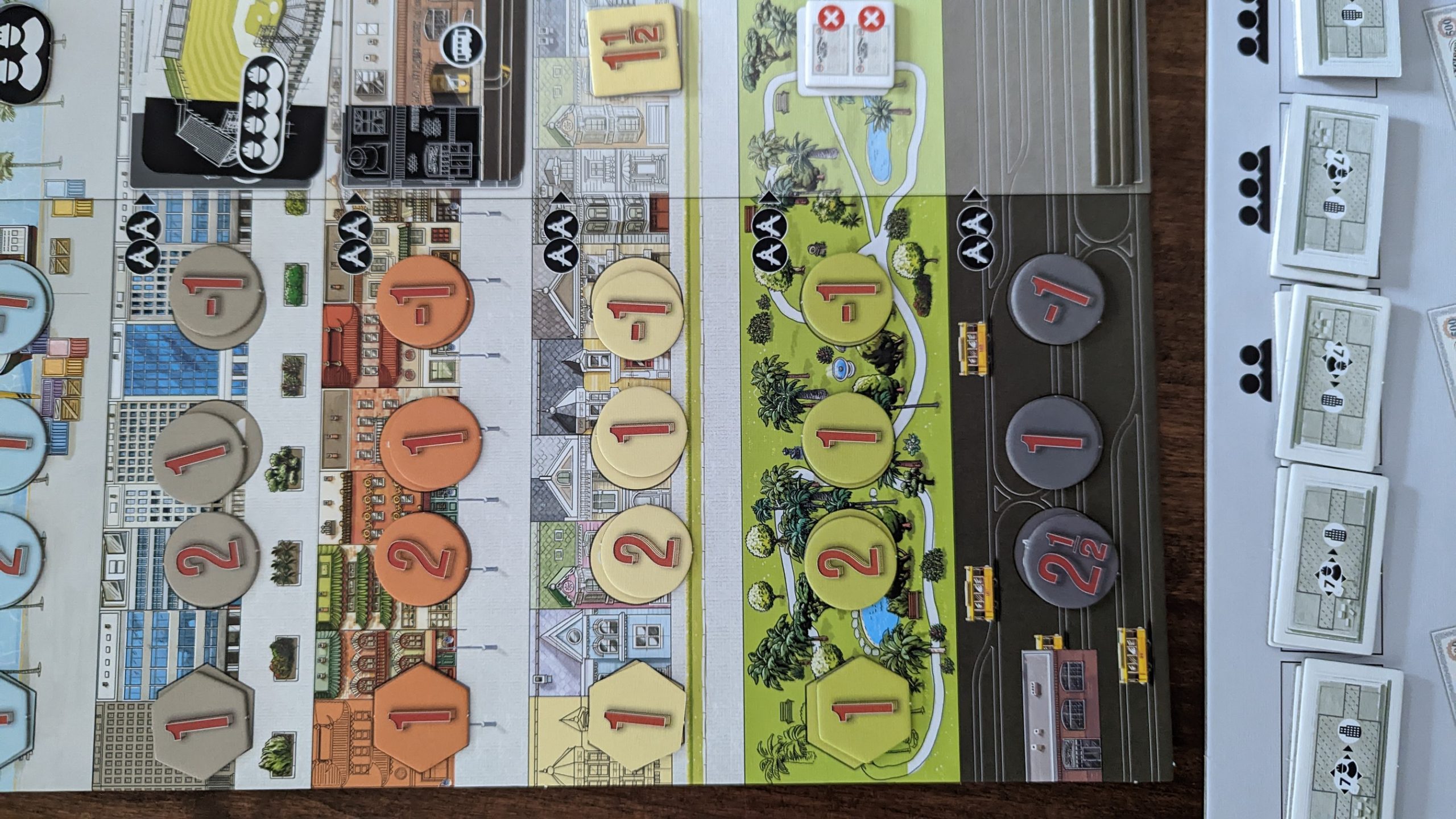 I could point to a number of issues that hold San Francisco’s gameplay back, but the main culprit is a lack of player agency. In most city builders, players decide where they place everything in their city, but here you’re just putting cards down left to right in their corresponding zones. Don’t get me wrong, adjacency matters, as skyscrapers can be built upon foundations once there are seven adjacent worker icons, and cards with track will be added to your cable car network, which functions as an extra zone for end-game scoring. Along with the skyscrapers, there are additional in-game points for the first player to complete each region, but with the contracts acting as a speed limiter, it doesn’t function as the race you’d think it would. In fact, every game I’ve played had the player with zero contracts pick up multiple region completion bonuses. The game ends as soon as either the last foundation has been placed or somebody fills their city board, and players start totaling workers for end-game scoring. Players compare workers in each region (except for cable car network, which in an unnecessarily complicating divergence from everything else, simply counts numbers of cars), with the most and least getting rewards or punishments, similar to military in Seven Wonders.