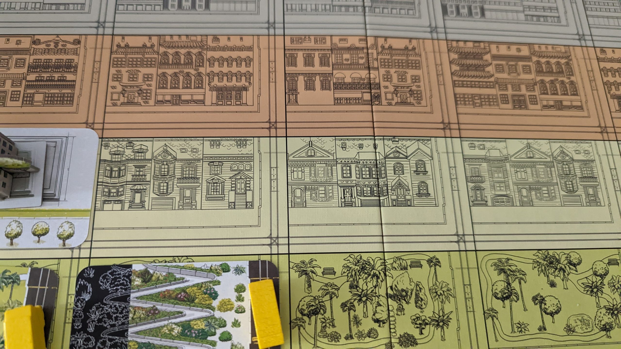 It all starts out promising enough with Knizia’s trademark simple rules: on a player’s turn, they either take a stack of cards and a contract to add them to the respective zones on their city board, or draw a card from the deck and add it to a stack of their choice. The twist is, you can only pick up stacks that have more cards than you have contracts. Additionally, there always has to be a player with no contracts, so when the last person without one picks up a stack, everyone discards a contract. At first blush, this is a simple enough balancing mechanic that keeps one person from gobbling up all the cards and rewards discretion when choosing to pick up or add to stacks. In practice, however, it handcuffs the game to the pickiest player, which will feel more like cement shoes if they also suffer analysis paralysis. In a deeper game, this would’ve been less noticeable, but San Francisco lacks the emergent gameplay present in Knizia’s stronger outings.