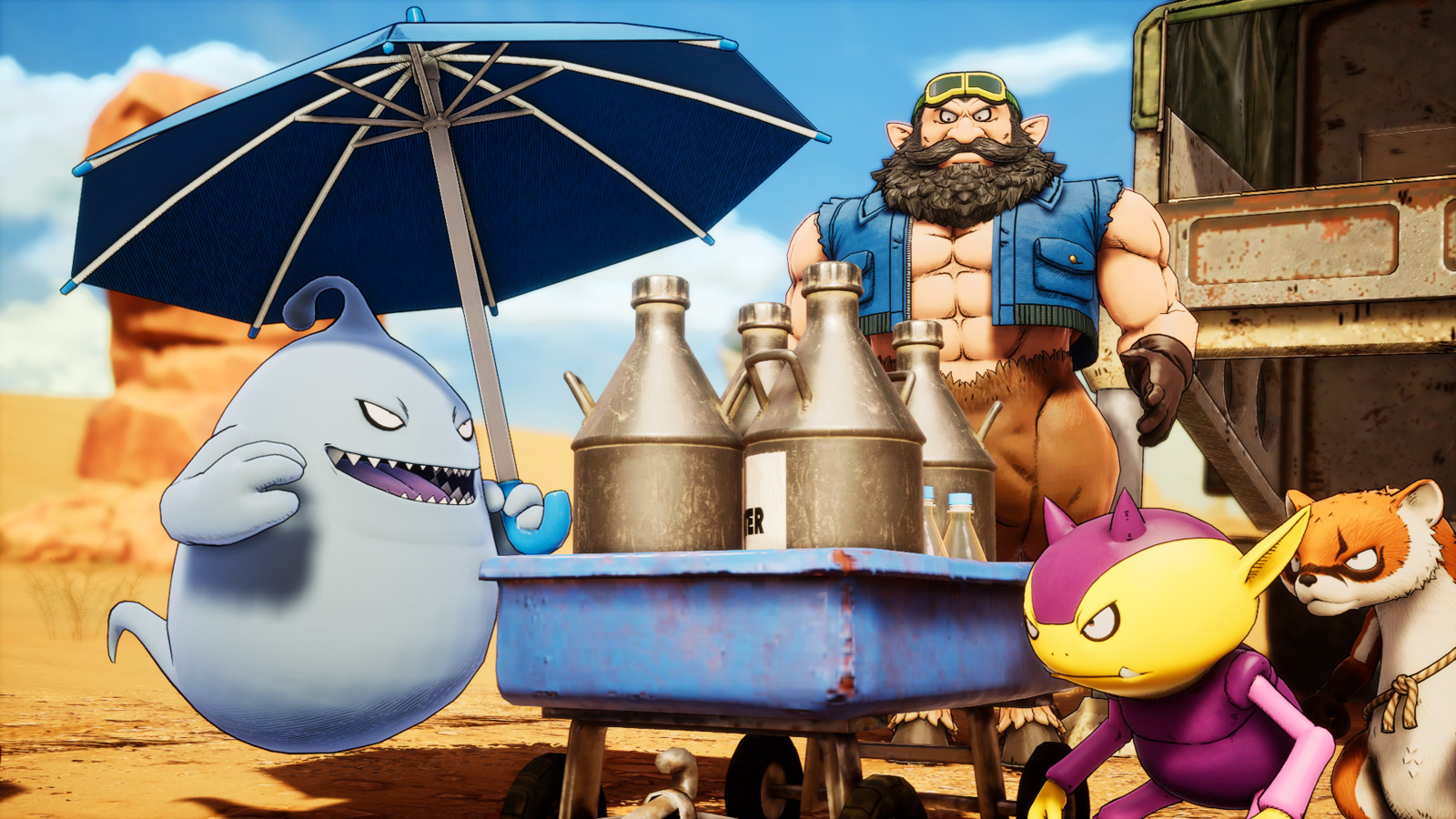 The moment I set foot in the game, I was hit with a thrilling storyline. I instantly flipped off my lights, got my favorite juice, and gave Sand Land my full attention. You play as the demon Fiend Prince, Beelzebub, whose primary objective is to steal water from unsuspecting humans who pass by the demon’s base. Yes, you read correctly, that stealing water is a daily pleasure for Beelzebub and his unique crew of demons. You are put into a dry and vacant world where humans and demons suffer from an extreme water shortage due to the wars that the humans kept waging between each other. The human species itself is on the brink of extinction and while Beelzebub cannot stand humans, he understands they are necessary for his village to get water. Therefore, there is a sort of symbiotic relationship going on. Everything is really, just sand and various rock forms. It’s not too soon in the game that you start to see the creative motifs of Toriyama like oddly shaped lifeforms, full of life and character.