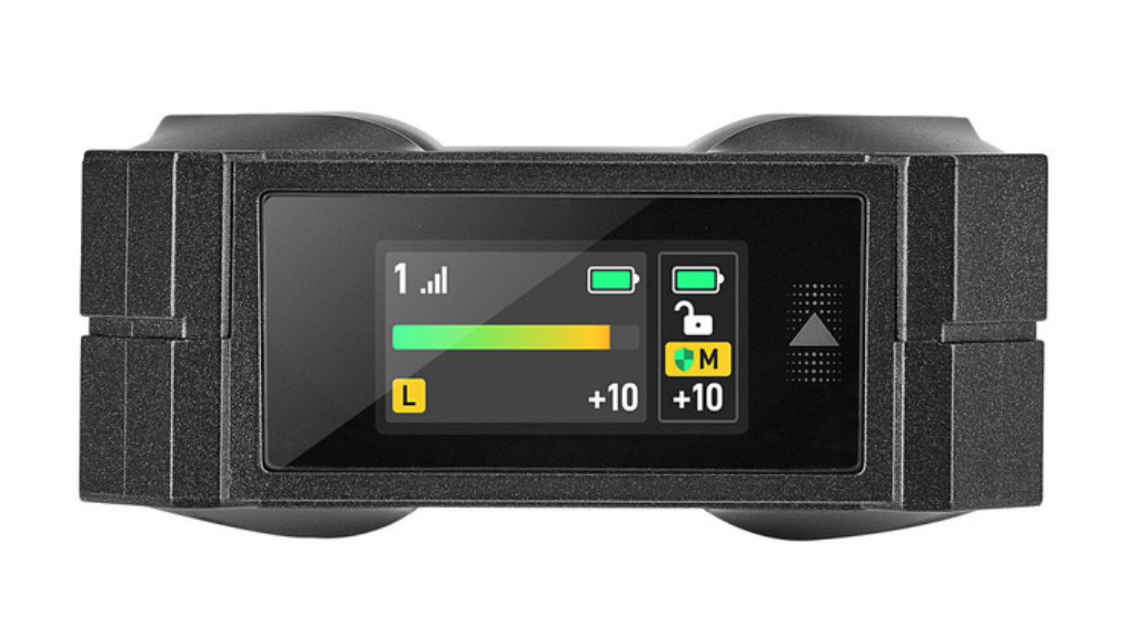 The receiver is square with a round charge port on both sides. This is handy if you aren’t using both transmitters as you can charge the other. On the side of the receiver lies three physical buttons with a touch screen on the opposite side. The buttons are labeled power and +/-. It doesn’t take a rocket scientist to figure out what these do, but be mindful when you are amping power on both the receiver and transmitter as it can have a multiplicative effect that could ruin the outcome. Test and retest, then go slow with those increments.