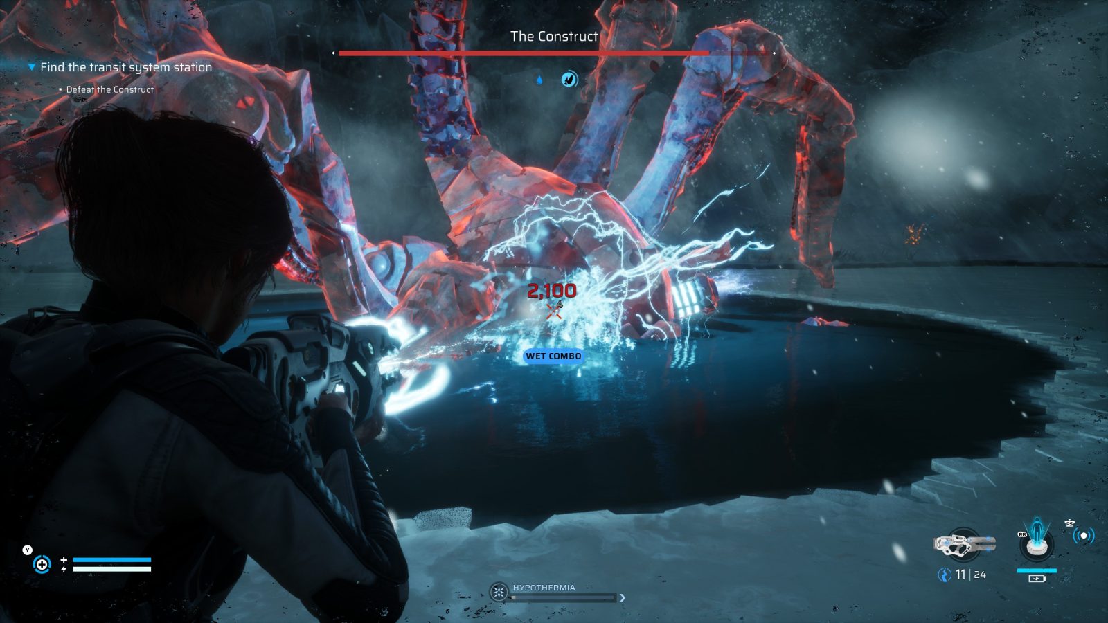 The game controls like you’d expect a modern third person shooter to control; Move with the left stick, aim with L2, and shoot with R2. You can swap between your four gun modes (electric, fire, ice, and acid) with the D-Pad and melee by pressing R2 without aiming. A dodge roll with generous invincibility frames can be used with Circle, though it will consume some stamina. You also have several gadgets at your disposal, selected in a radial menu holding L1 and used with R1. These can use one of two resources, Resin or Battery, but both are very easy to come by along with ammo.