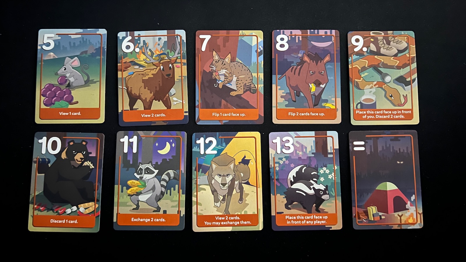 Cards valued 5-13 have actions listed on them. To use the action, players will discard the card to the common discard pile. Actions include flipping cards over and revealing their values, switching cards between campsites, viewing face down cards, and discarding cards. Even though you are playing on teams, you must keep hidden information hidden from all players. Unless specified, players are able to use action cards with any campsites and even the draw and discard piles.