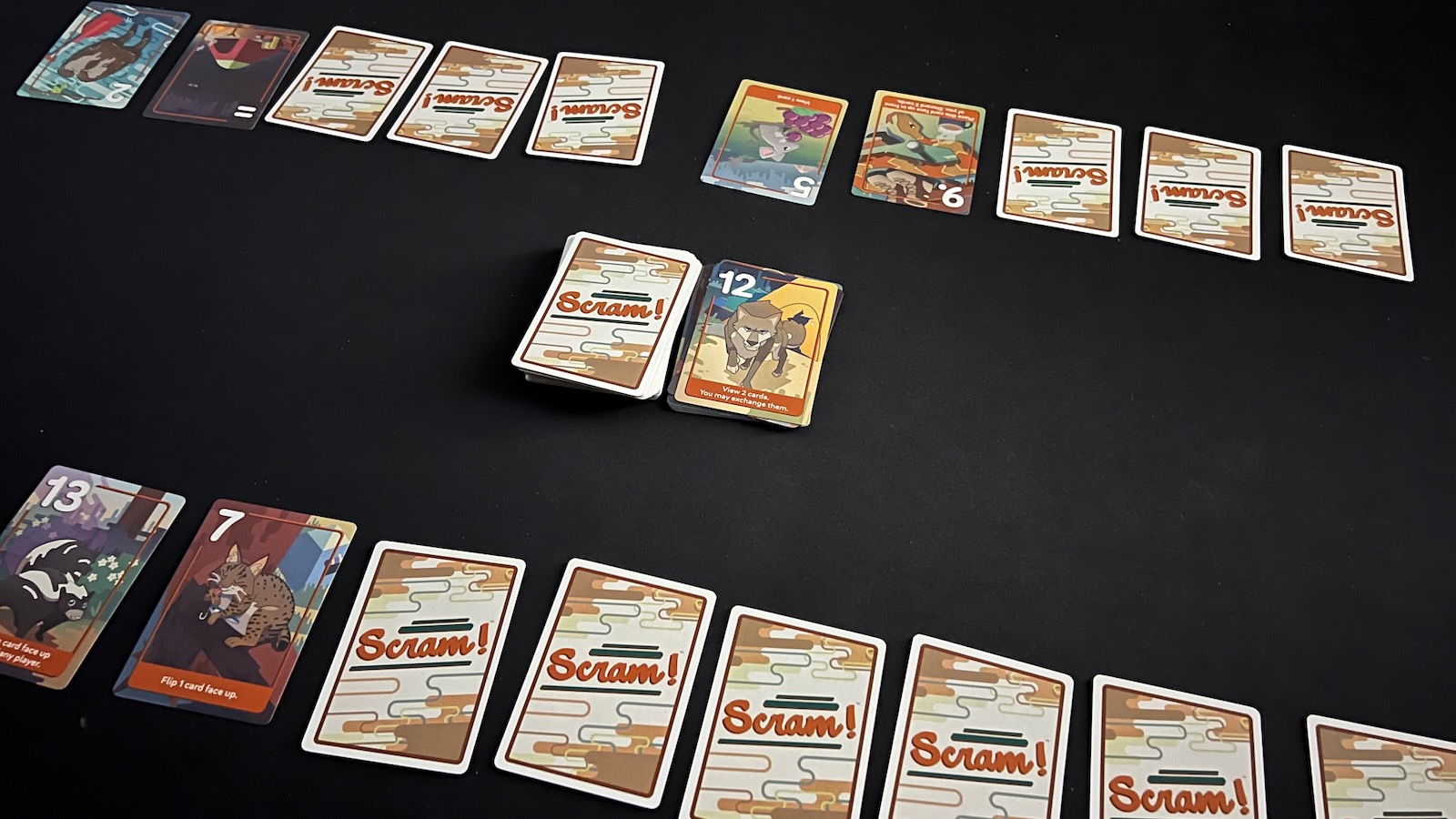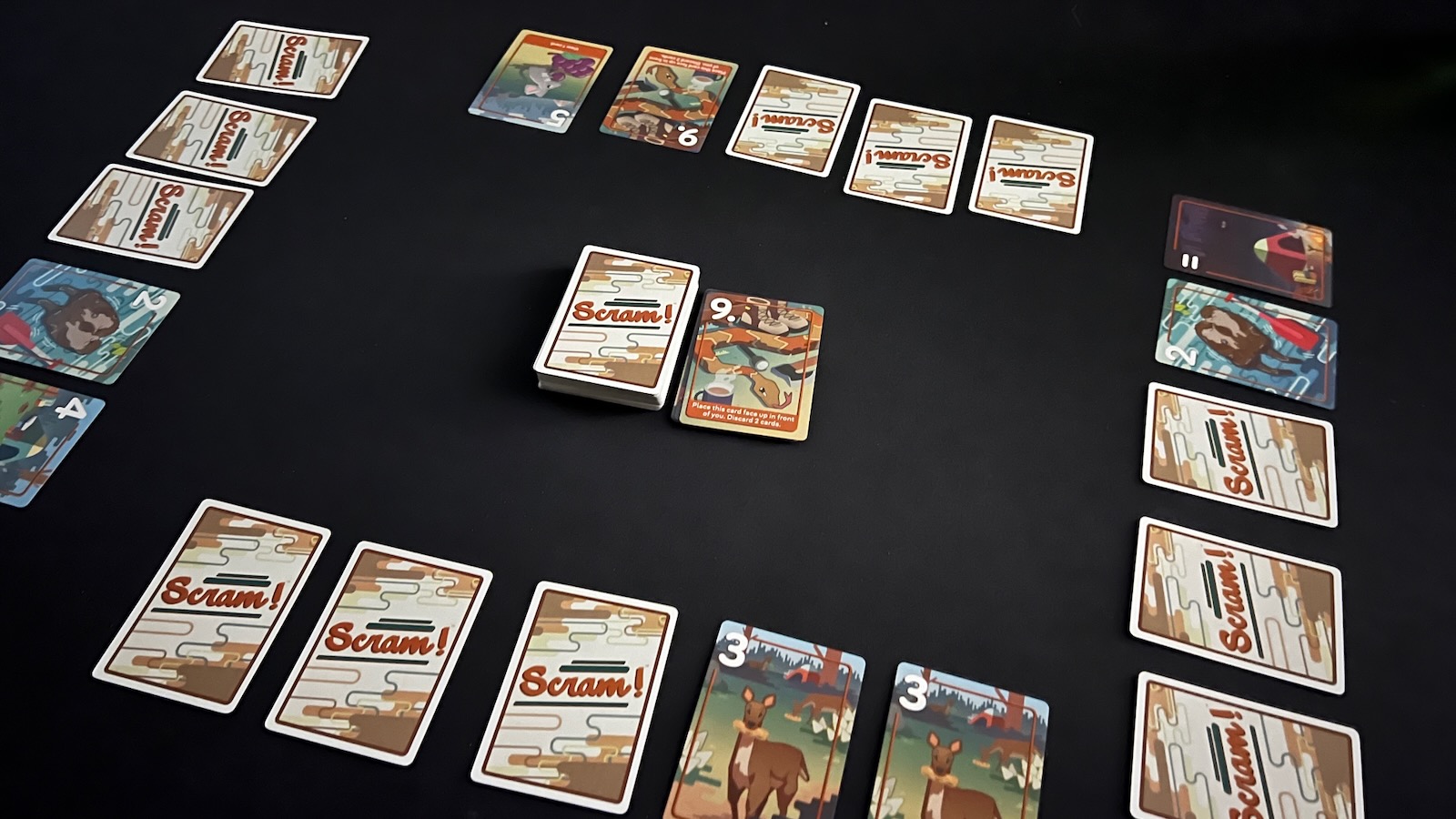 If a player has 2 or fewer cards on their turn, they can declare Scram! This triggers an end of round phase. Each other player has one final turn. A round can also end immediately if the draw deck is empty at the start of a player turn.