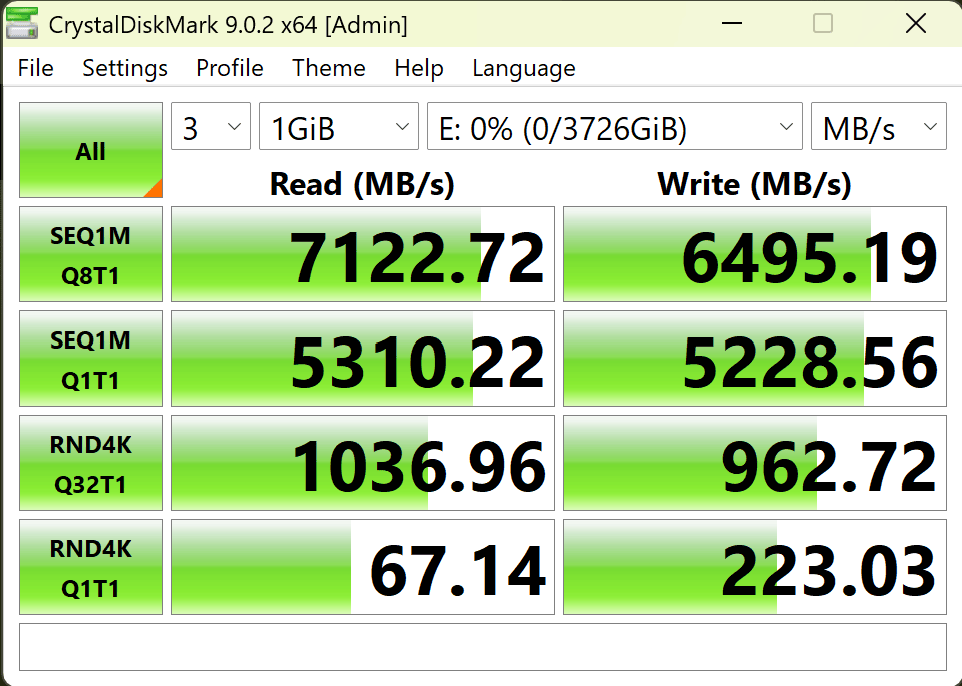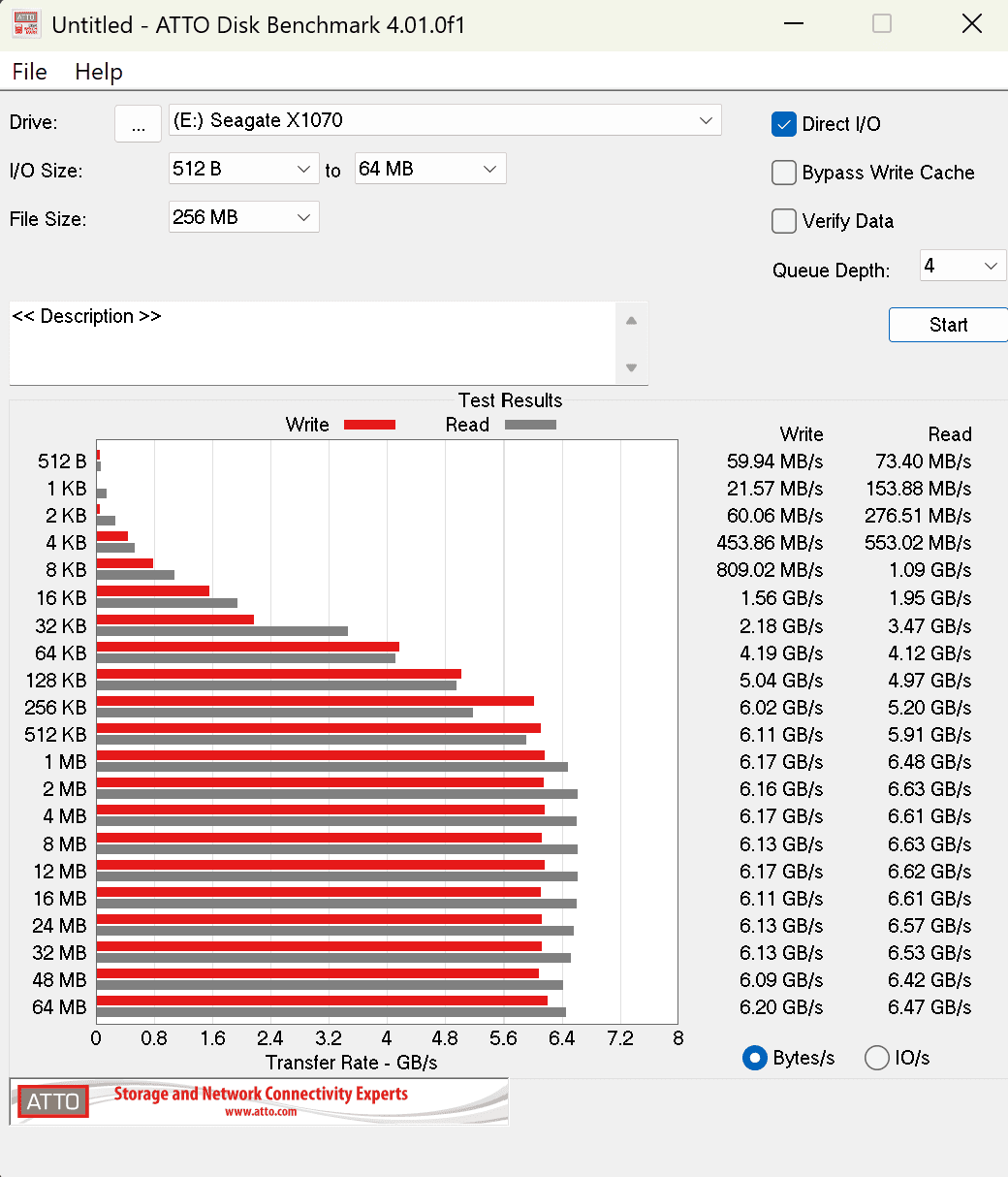 It's always nice to see a drive deliver precisely what it advertises. With very little deviation, this drive can deliver around 7200 MB/s read and 6400 MB/s write speeds in CrystalDiskMark. Now let's take a look at a longitudinal test with ATTO.
