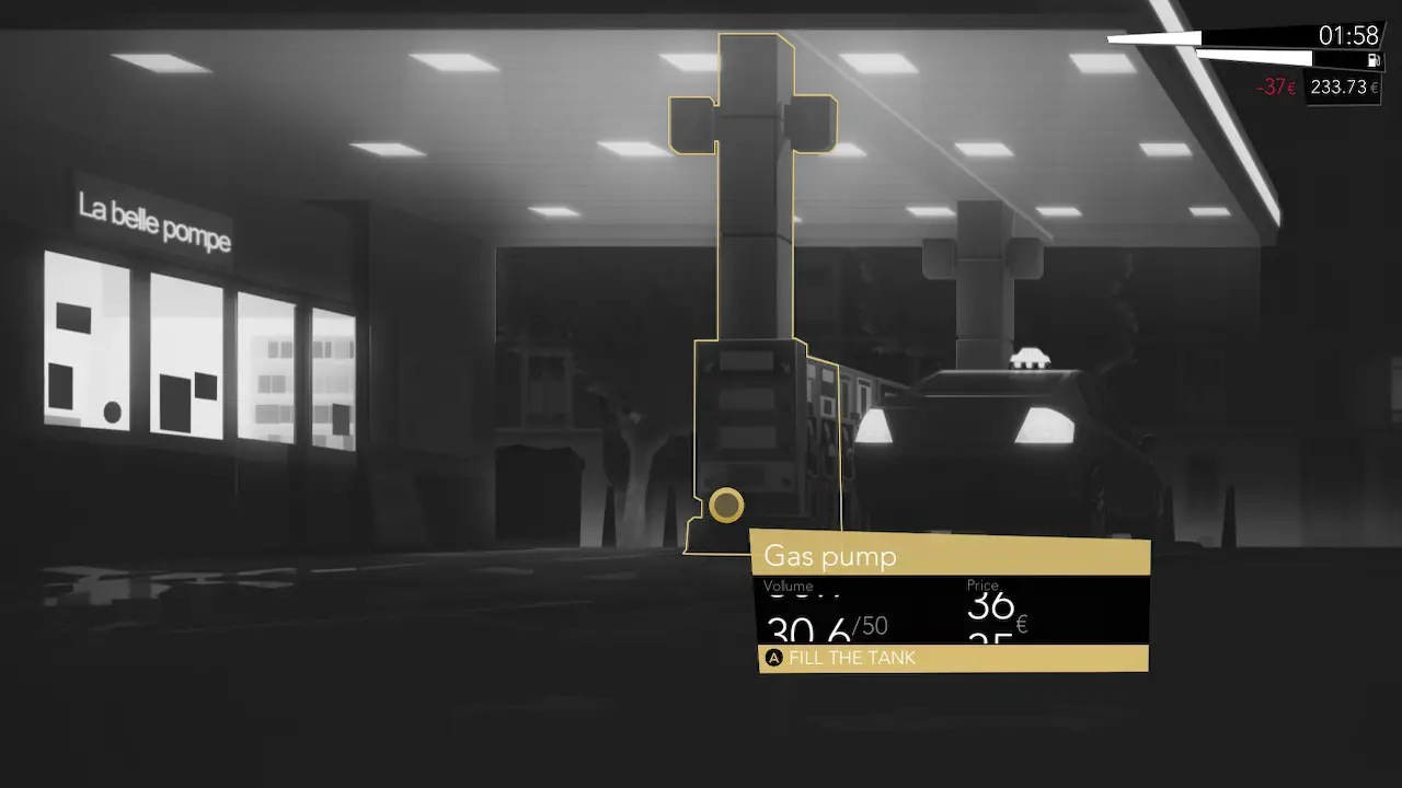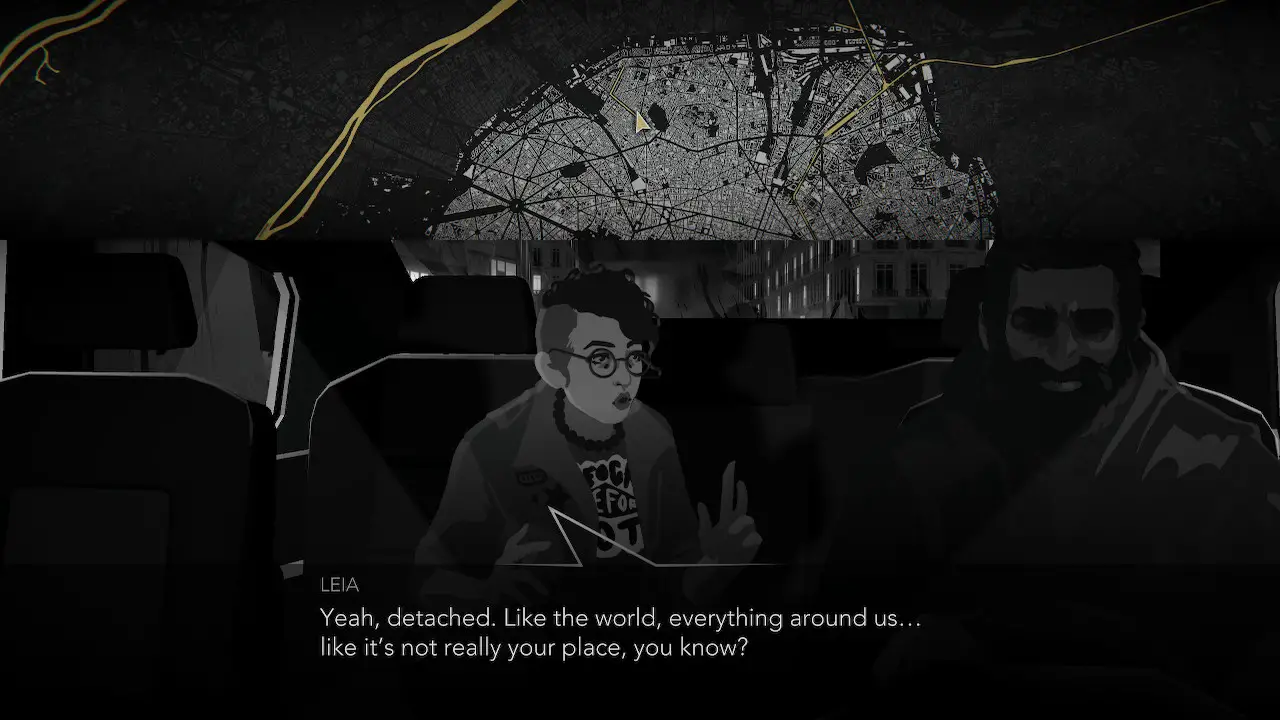 As you drive around Paris, you’ll be listening to a chill, synthetic soundtrack that will put you in the mood to read and think. It’s reminiscent of a cyberpunk noir in the best way, even though the game takes place in modern day and touches on a few current issues. The game is presented in black, white, and yellow solidifying this noir atmosphere. The characters are also smoothly animated, even if they repeat animations constantly.