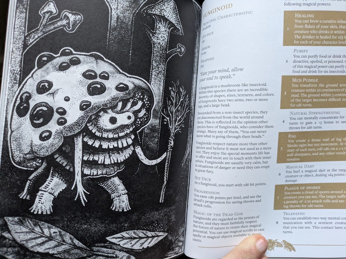Mechanically, there are many tables dealing with the nature of the landscape and the effects of radiation or hostile bodily gasses. You can also play as 6 types of insects, each with their own strengths and weaknesses. All of the insects share the book’s main atmosphere of weird inhumanity, like the Fungoid’s extendible limbs. There is a question of balance here, as some species have dark vision, but the Fungoids are totally immune to radiation and poison. As each class has some kind of huge strength, like the Bee’s flight or the Scarafajus’ ability to burrow. Most interesting are the mutated, nigh-Lovecraftian creatures that come in the minimal, 19-entry antagonist section. Ideally things would get weirder and more dangerous the deeper you get into the interior, closing in on some revelation. Instead, the book doesn’t have much consideration for depth or increasing threat beyond a few mentions. There are also some new spells to fit with this fetid world, like the ability to summon up a geyser of pus from the Dead God’s skin.