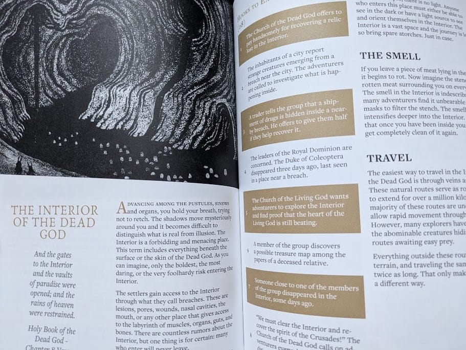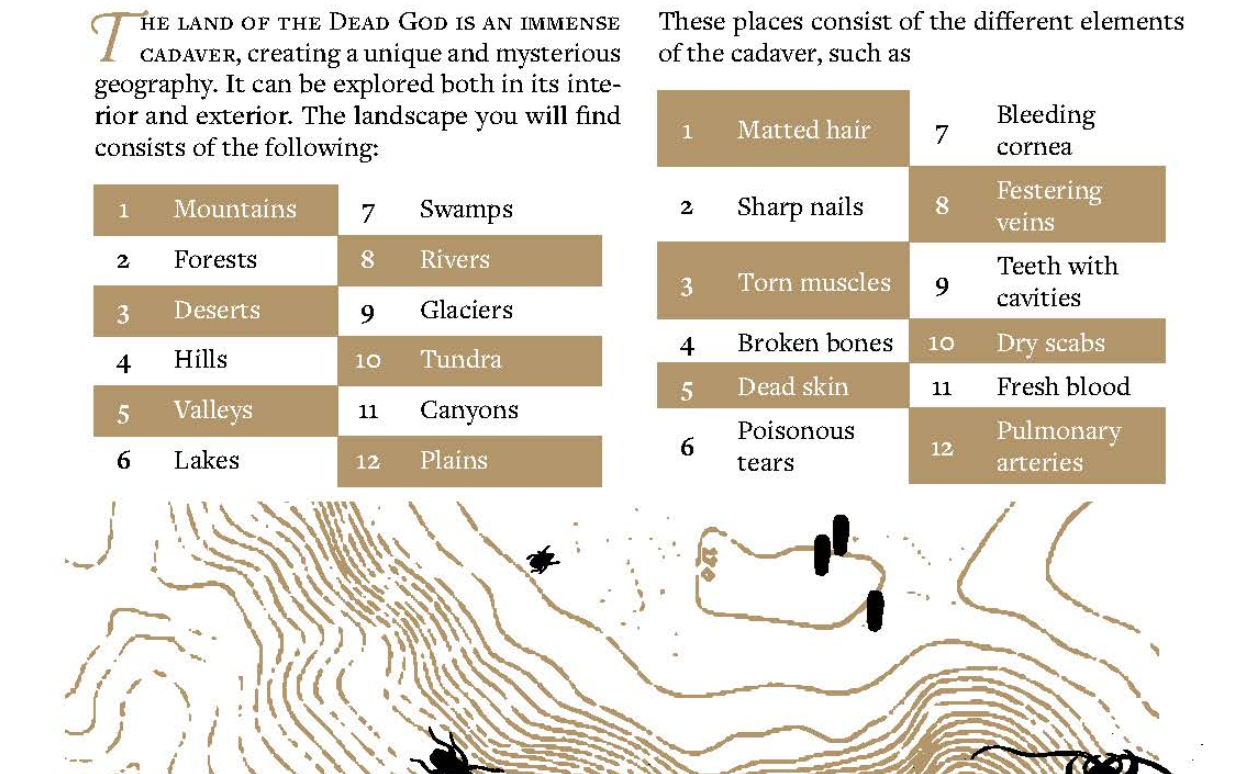 The larger issue comes from the nature of the crawl itself. We don’t have a map of the Dead God, as the insects aren’t certain what form it takes. It could be a human or alien or something else entirely. So you move forward via hexes of…what? The God is not organized in any way we can detect. Its setting has details about what settlements or resources or adventures you could find in the many body parts, like arms and the head and the interior, but you have no idea where these things are in relation to one another. The random locations have no weight based on proximity, so you could go directly from a glacier in teeth with cavities to deserts in the pulmonary arteries. Maybe the God is supposed to be contorted strangely in death. At a total length of 200 km, with you traveling 1 km per day, it’s enormous, but large enough that you should have some idea of the shape of things.