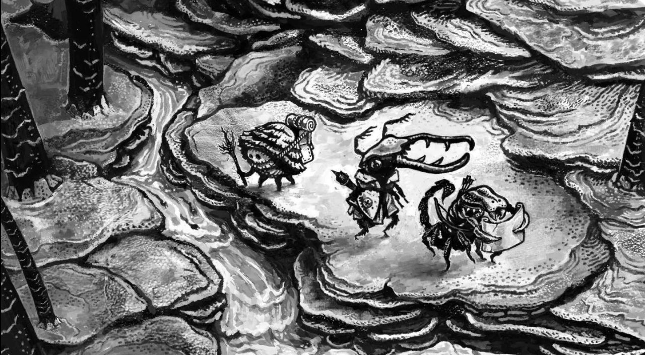 These issues are less with the lore than the mechanics. Lorewise, as much as there is interest in the many hooks and factions, the meat of the adventures presented aren’t that different from normal D&D: head out, find treasure, come back and level up. Many of the events on random tables could come out of any fantasy setting, regardless of the fact that you’re insect people living in a giant corpse. Most of the random tables lack mechanics. That’s generally fine; this is a generic setting book for OSR, where the stats are easy to work on. The problem comes in where the entries are in that realm of lacking description or generic so that they aren’t appreciably different from one another. For the relic generator, what is the important difference between Faithful Esophagus, Sacrosanct Pancreas, and Sacred Brain? There isn’t enough real connective tissue in here to use this as a hexcrawl, not without some hard work on the DM’s end. Once you’ve figured out how you want to approach the setting, there is a lot of intrigue to uncover.
