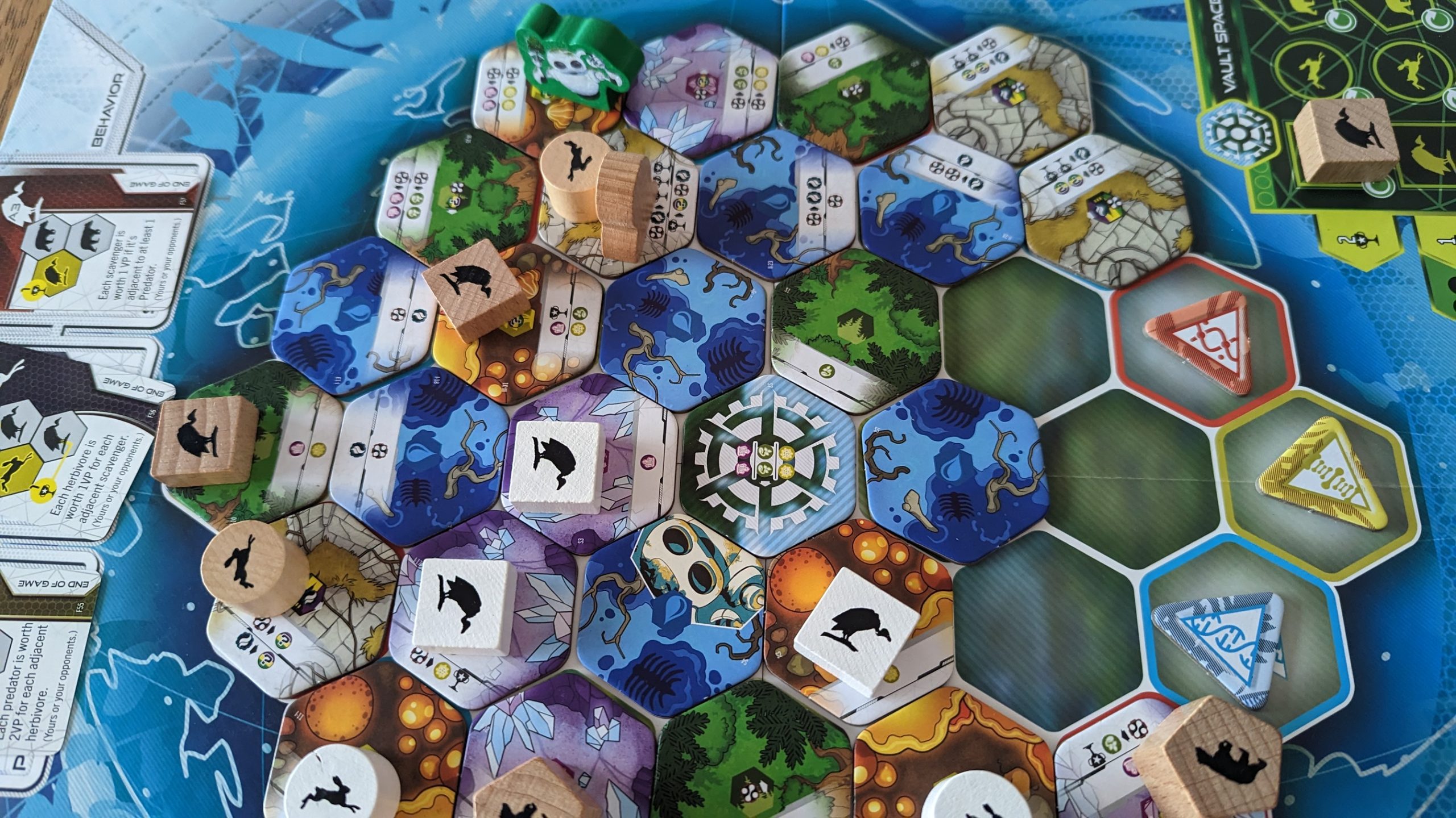 These tokens are another brilliant design decision in a game chock-full of them, as they provide more decision space in so many ways. Accounting for the massive amount of points they potentially represent, otherwise suboptimal plays suddenly become thoroughly viable. At all stages of the game, players are encouraged to undermine themselves by placing animals in places that they won’t score as well, adding cards that don’t work with their engine, and even playing tiles when introducing animals and running engines actually provides more resources than It would cost, all in the name of those sweet exponents.