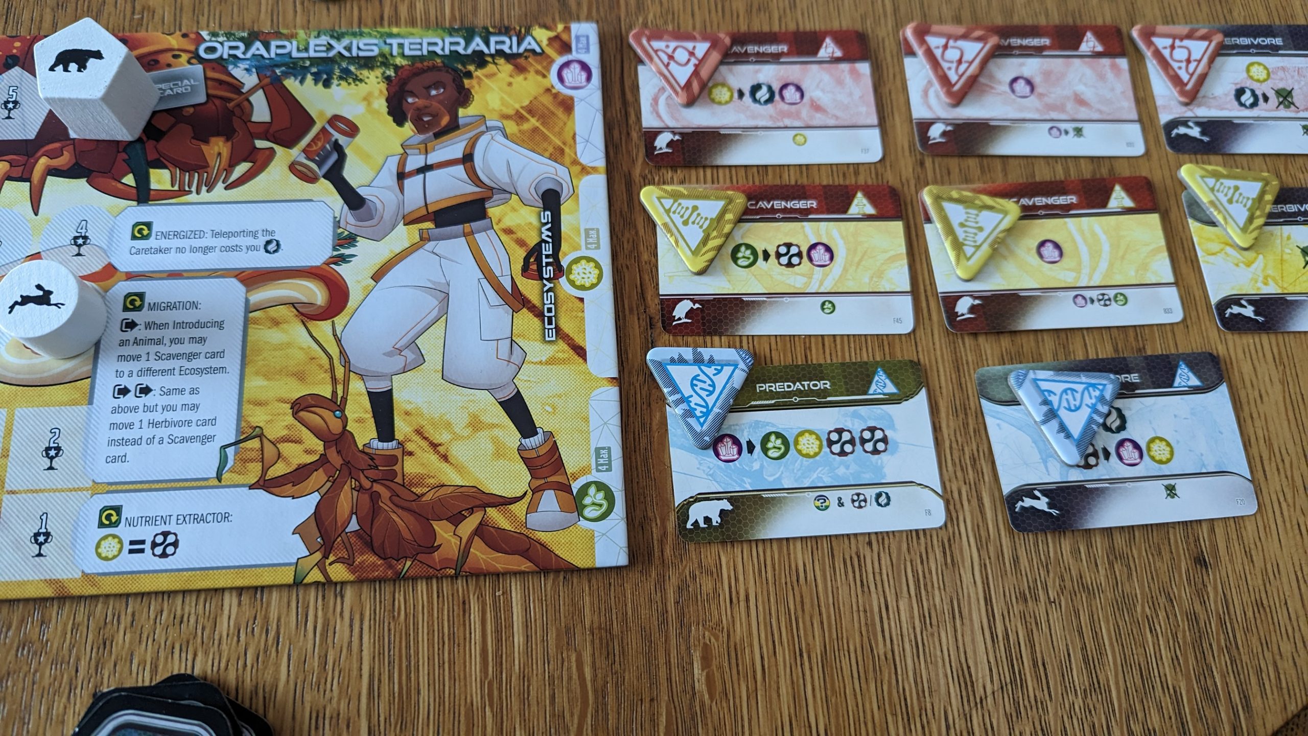 You’d think if introducing animals not only unlocks powers but also builds and runs your engine, it would stand to reason that it would be your primary pursuit, only playing tiles when you’re totally out of resources. On the contrary, some excellently designed sub-mechanics maintain a balance between the two actions throughout the course of the game. The most obvious early game incentive is to have the resources to pay for an animal that unlocks a stronger ability than the one-cost scavenger, but most shapers have powers that benefit from the map being laid out in a specific way, so dictating the map layout in the early and mid game is beneficial to them. As the game goes on and players’ engines become stronger, tiles become more powerful, from both the conversions offered and the opportunity to scoop up the DNA tokens seeded on the edge of the map during setup. At the end of the game, players will place their DNA tokens on animals that can take the appropriate color, with like color tokens in the same biome scoring exponentially, but leftovers cover over the points depicted on player boards for introducing animals.
